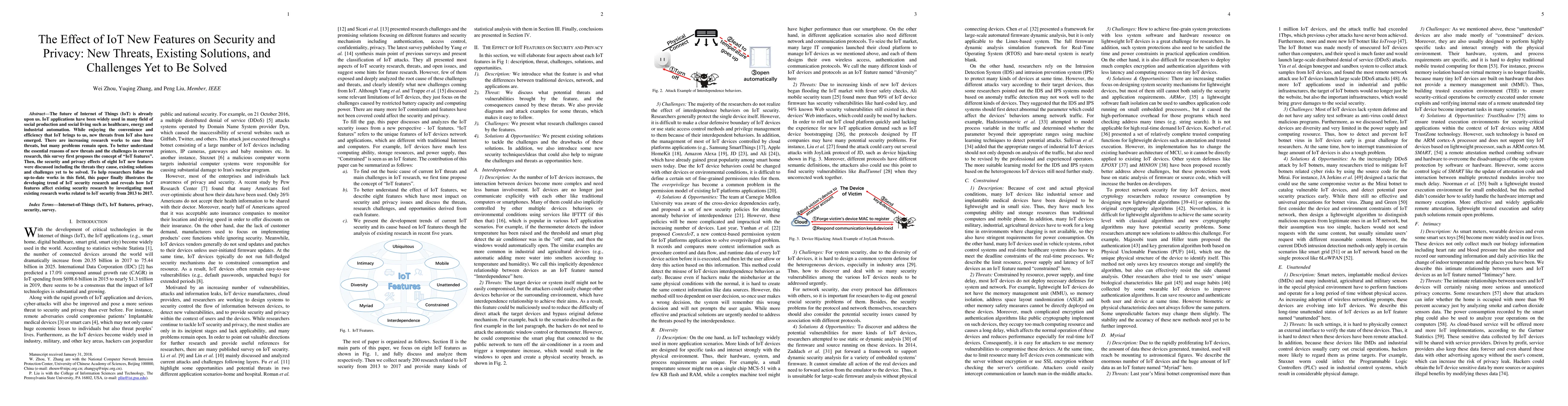 This paper surveys the security and privacy threats arising from new Internet of Things (IoT) features, discusses existing solutions and ongoing challenges, and highlights trends in IoT security research from 2013 to 2017. It identifies the key factors contributing to new threats and analyzes how IoT features influence current security research efforts.