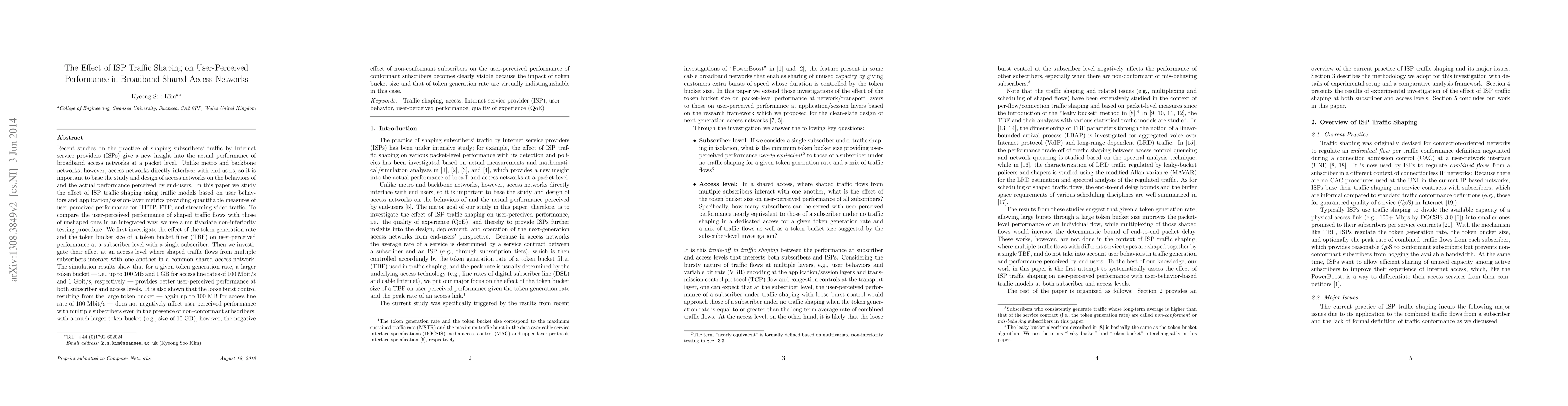 This paper examines how Internet Service Provider (ISP) traffic shaping affects user-perceived performance in broadband shared access networks, using multivariate non-inferiority testing. It finds that larger token bucket sizes improve perceived performance, but excessive sizes can amplify the negative impact of non-conforming users.