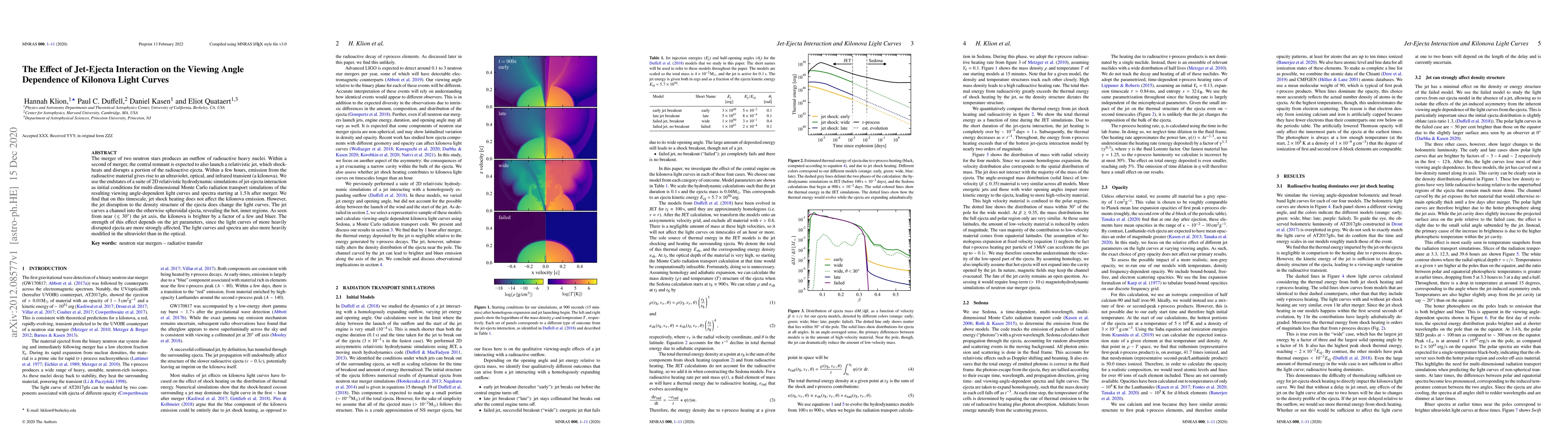 The merger of two neutron stars produces an outflow of radioactive heavy nuclei. Within a second of merger, the central remnant is expected to also launch a relativistic jet, which shock-heats and disrupts a portion of the radioactive ejecta. Within a few hours, emission from the radioactive material gives rise to an ultraviolet, optical, and infrared transient (a kilonova). We use the endstates of a suite of 2D relativistic hydrodynamic simulations of jet-ejecta interaction as initial conditions for multi-dimensional Monte Carlo radiation transport simulations of the resulting viewing angle-dependent light curves and spectra starting at 1.5h after merger. We find that on this timescale, jet shock heating does not affect the kilonova emission. However, the jet disruption to the density structure of the ejecta does change the light curves. The jet carves a channel into the otherwise spheroidal ejecta, revealing the hot, inner regions. As seen from near ($\lesssim 30 \deg$) the jet axis, the kilonova is brighter by a factor of a few and bluer. The strength of this effect depends on the jet parameters, since the light curves of more heavily disrupted ejecta are more strongly affected. The light curves and spectra are also more heavily modified in the ultraviolet than in the optical.