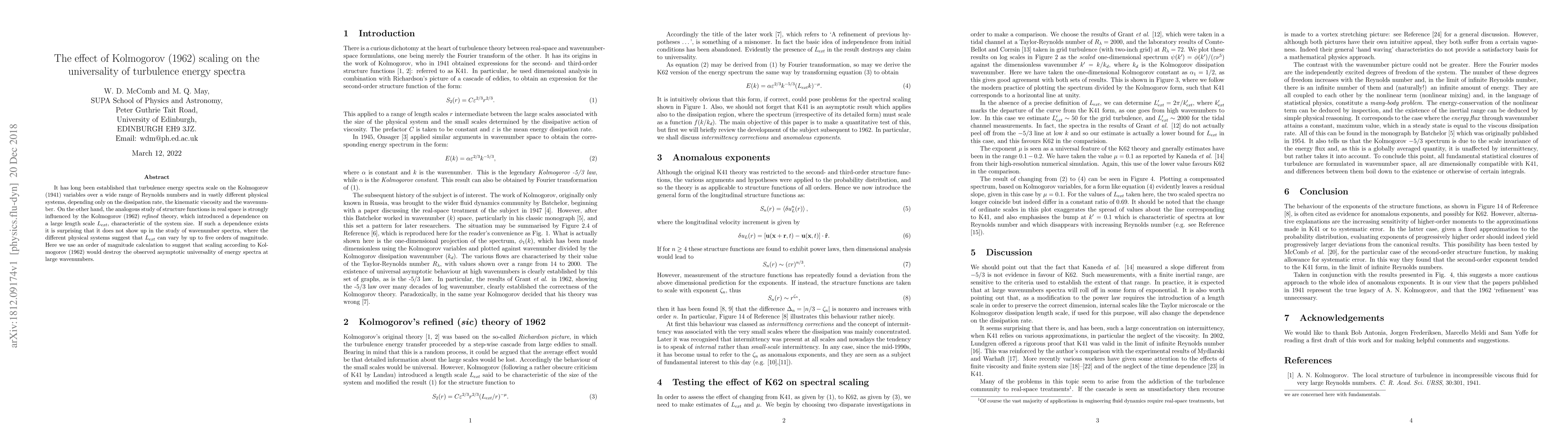 It has long been established that turbulence energy spectra scale on the Kolmogorov (1941) variables over a wide range of Reynolds numbers and in vastly different physical systems, depending only on the dissipation rate, the kinematic viscosity and the wavenumber. On the other hand, the analogous study of structure functions in real space is strongly influenced by the Kolmogorov (1962) refined theory, which introduced a dependence on a large length scale Lext, characteristic of the system size. If such a dependence exists it is surprising that it does not show up in the study of wavenumber spectra, where the different physical systems suggest that Lext can vary by up to five orders of magnitude. Here we use an order of magnitude calculation to suggest that scaling according to Kolmogorov (1962) would destroy the observed asymptotic universality of energy spectra at large wavenumbers.
