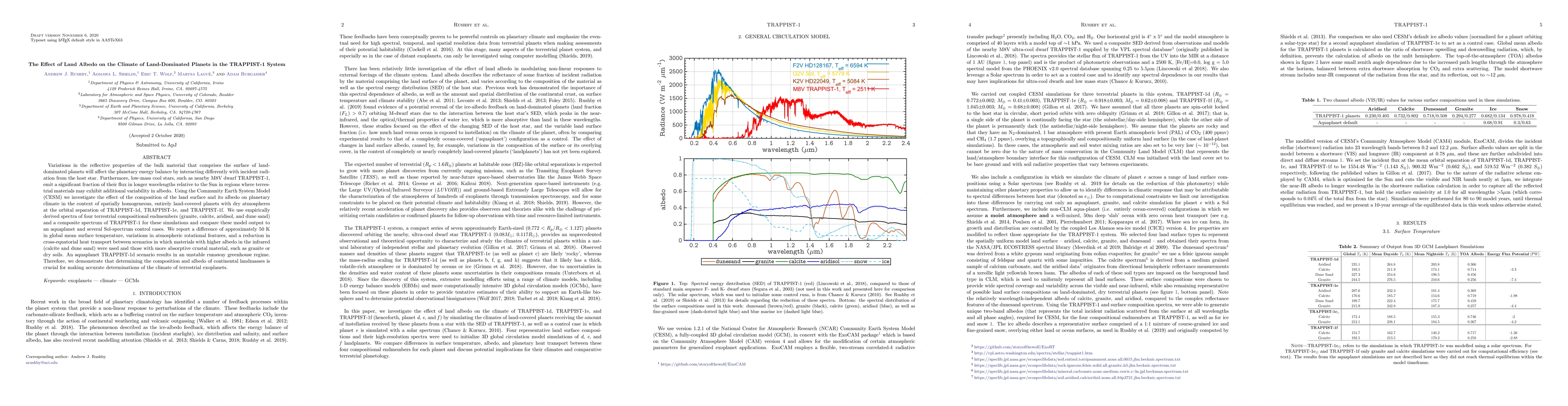 The study uses the Community Earth System Model (CESM) to investigate the effect of land surface composition and albedo on planetary climate for land-dominated planets in the TRAPPIST-1 system. Empirical spectra of four terrestrial compositional endmembers and TRAPPIST-1's composite spectrum are used for simulations, comparing results with aquaplanet and solar spectrum control cases.