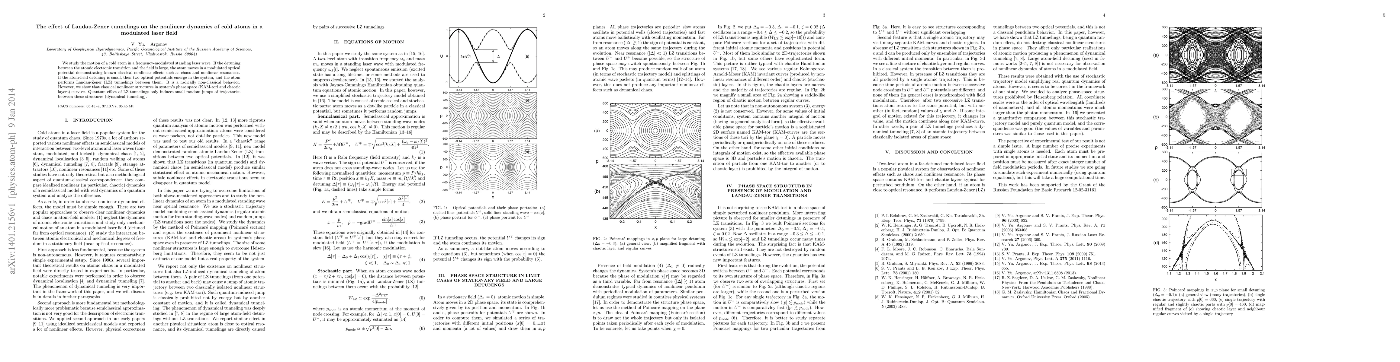 We study the motion of a cold atom in a frequency-modulated standing laser wave. If the detuning between the atomic electronic transition and the field is large, the atom moves in a modulated optical potential demonstrating known classical nonlinear effects such as chaos and nonlinear resonances. If the atom-field detuning is small, then two optical potentials emerge in the system, and the atom performs Landau-Zener (LZ) tunnelings between them. It is a radically non-classical behavior. However, we show that classical nonlinear structures in system's phase space (KAM-tori and chaotic layers) survive. Quantum effect of LZ tunnelings only induces small random jumps of trajectories between these structures (dynamical tunneling).