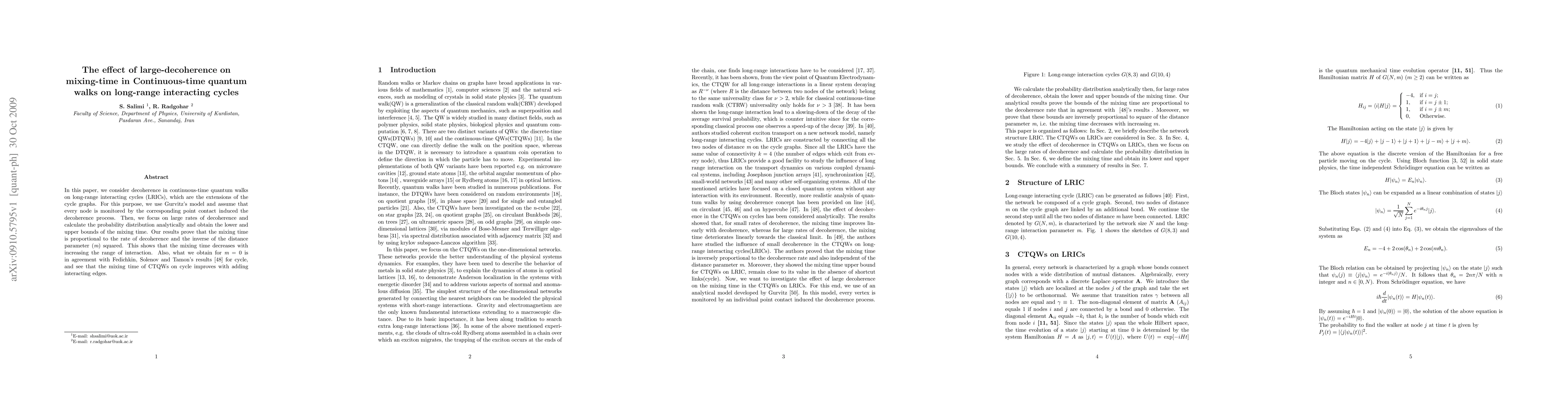 This paper investigates the impact of large decoherence rates on the mixing time in continuous-time quantum walks on long-range interacting cycles (LRICs). Using Gurvitz's model, it finds that the mixing time is proportional to the decoherence rate and inversely proportional to the square of the interaction distance parameter, showing that mixing time decreases with increased interaction range.