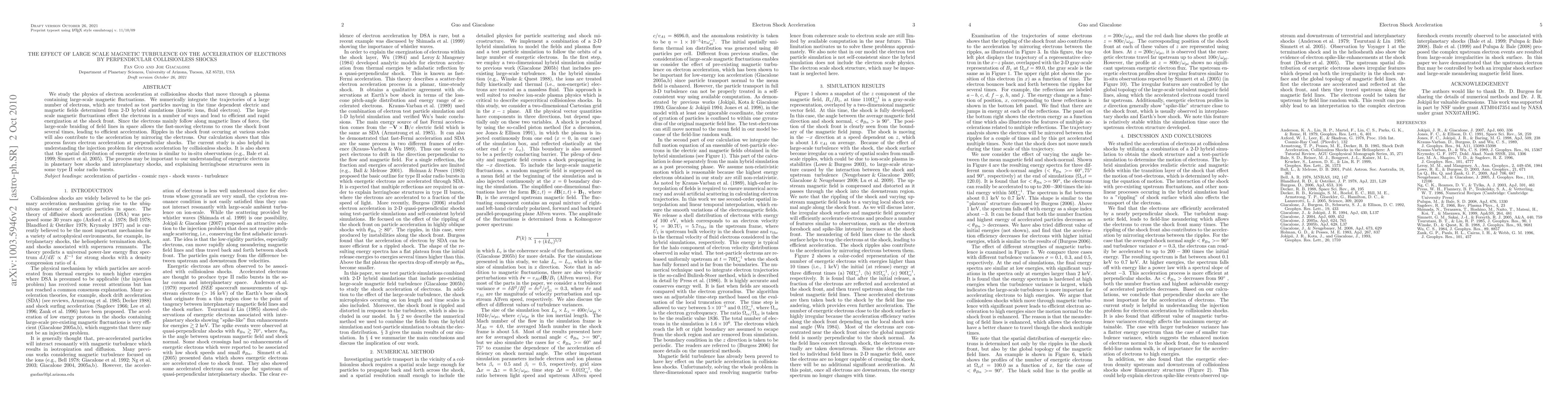 This paper investigates electron acceleration at collisionless shocks through large-scale magnetic turbulence, demonstrating efficient energization due to electrons repeatedly crossing the shock front. The study highlights the importance of perpendicular shocks in this process, with implications for understanding energetic electrons in planetary and interplanetary environments.