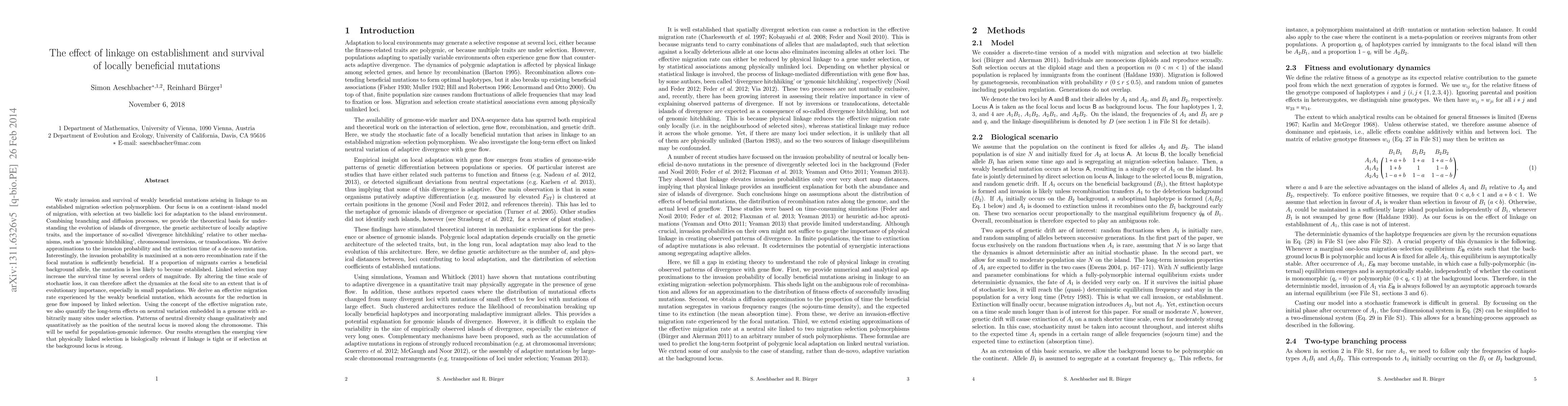 This paper investigates how linkage affects the establishment and survival of beneficial mutations in heterogeneous environments, finding that intermediate recombination rates can be favorable. It provides a rule of thumb for when physical linkage significantly boosts the probability of mutation establishment and prolongs its survival.