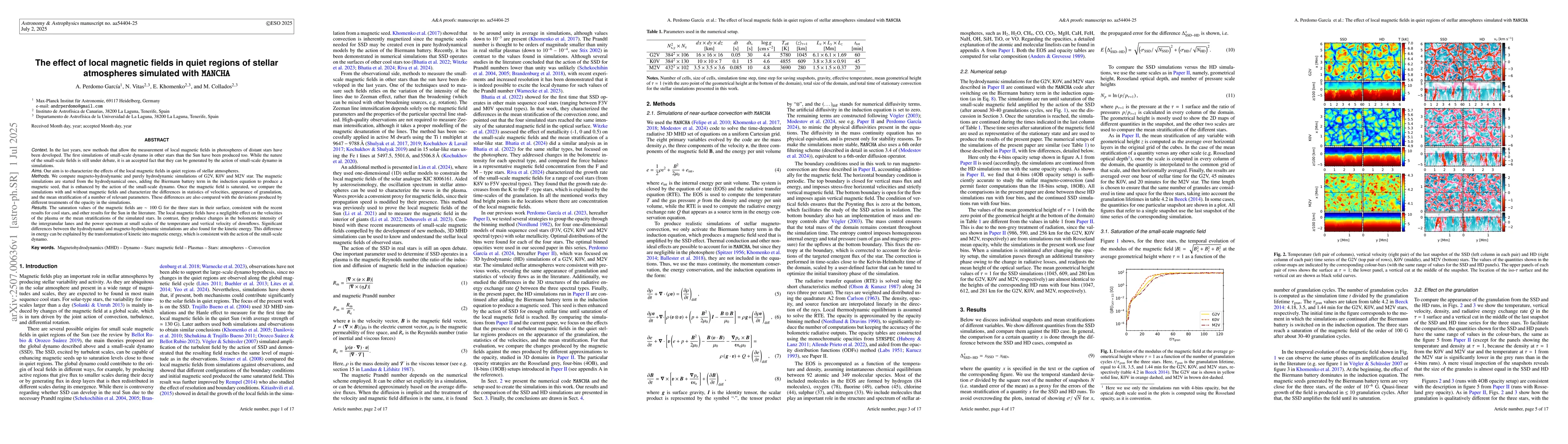Our aim is to characterize the effects of the local magnetic fields in quiet regions of stellar atmospheres. We compute magneto-hydrodynamic and purely hydrodynamic simulations of G2V, K0V and M2V star. The magnetic simulations are started from the hydrodynamical ones, adding the Biermann battery term in the induction equation to produce a magnetic seed, that is enhanced by the action of the small-scale dynamo. Once the magnetic field is saturated, we compare the simulations with and without magnetic fields and characterize the differences in statistics of velocities, appearance of granulation, and the mean stratification of a number of relevant parameters. These differences are also compared with the deviations produced by different treatments of the opacity in the simulations. The saturation values of the magnetic fields are $\sim 100$ G for the three stars in their surface, consistent with the recent results for cool stars, and other results for the Sun in the literature. The local magnetic fields have a negligible effect on the velocities of the plasma or the mean stratifications of the simulated stars. In contrast, they produce changes in the bolometric intensity of the intergranular lanes and the power spectrum at small scales of the temperature and vertical velocity of downflows. Significant differences between the hydrodynamic and magneto-hydrodynamic simulations are also found for the kinetic energy. This difference in energy can be explained by the transformation of kinetic into magnetic energy, which is consistent with the action of the small-scale dynamo.