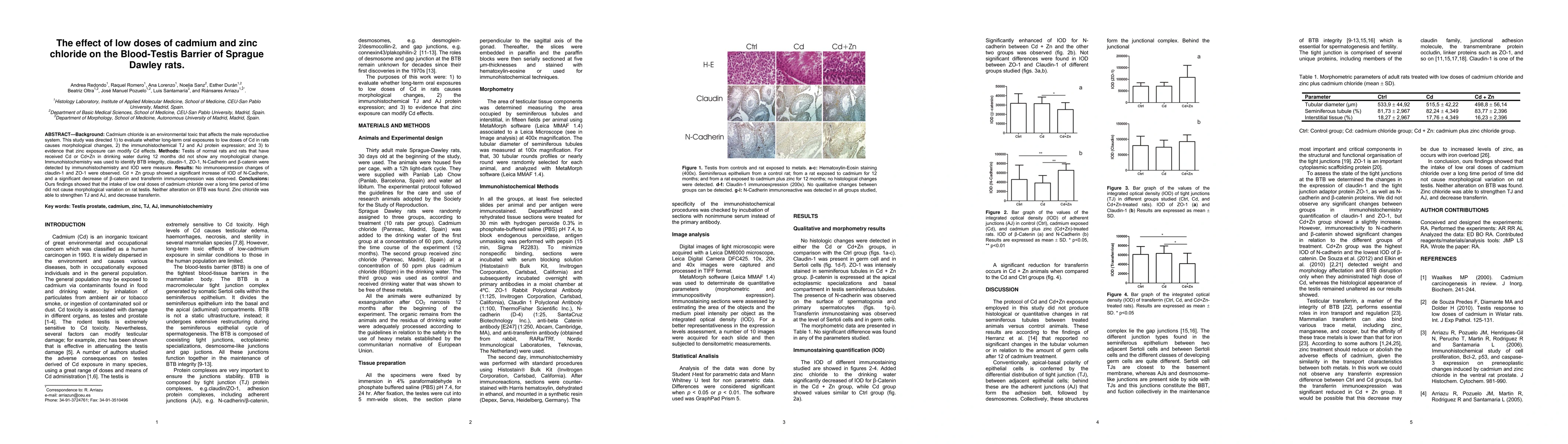 Background: Cadmium chloride is an environmental toxic that affects the male reproductive system. This study was directed 1) to evaluate whether long-term oral exposures to low doses of Cd in rats causes morphological changes, 2) the immunohistochemical TJ and AJ protein expression; and 3) to evidence that zinc exposure can modify Cd effects. Methods: Testis of normal rats and rats that have received Cd or Cd+Zn in drinking water during 12 months did not show any morphological change. Immunohistochemistry was used to identify BTB integrity, claudin-1, ZO-1, N-Cadherin and {\beta}-catenin were detected by immunohistochemistry and IOD were measure. Results: No immunoexpression changes of claudin-1 and ZO-1 were observed. Cd + Zn group showed a significant increase of IOD of N-Cadherin, and a significant decrease of {\beta}-catenin and transferrin immunoexpression was observed. Conclusions: Ours findings showed that the intake of low oral doses of cadmium chloride over a long time period of time did not cause morphological variation on rat testis. Neither alteration on BTB was found. Zinc chloride was able to strengthen TJ and AJ, and decrease transferrin. Key words: Testis prostate, cadmium, zinc, TJ, AJ, immunohistochemistry