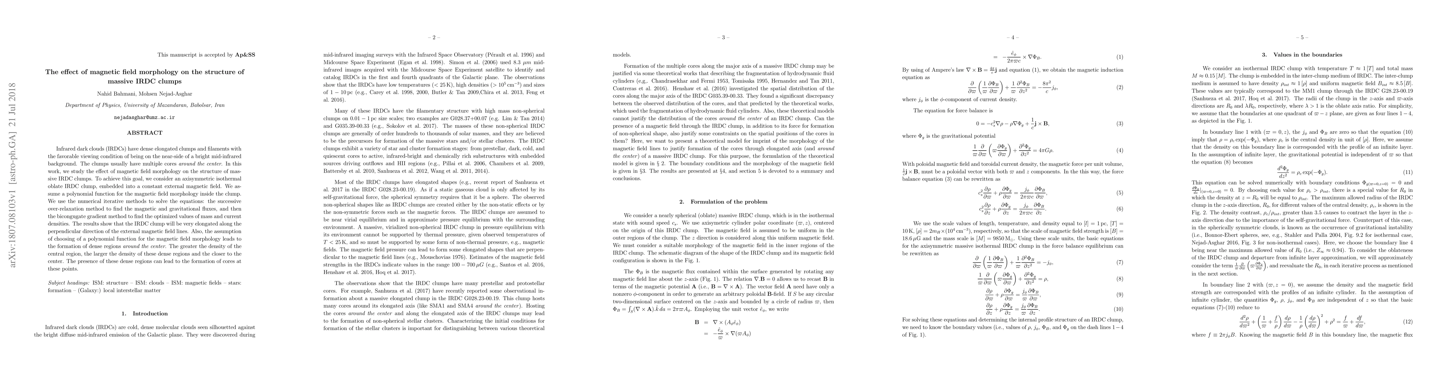 Infrared dark clouds (IRDCs) have dense elongated clumps and filaments with the favorable viewing condition of being on the near-side of a bright mid-infrared background. The clumps usually have multiple cores around the center. In this work, we study the effect of magnetic field morphology on the structure of massive IRDC clumps. To achieve this goal, we consider an axisymmetric isothermal oblate IRDC clump, embedded into a constant external magnetic field. We assume a polynomial function for the magnetic field morphology inside the clump. We use the numerical iterative methods to solve the equations: the successive over-relaxation method to find the magnetic and gravitational fluxes, and then the bicongugate gradient method to find the optimized values of mass and current densities. The results show that the IRDC clump will be very elongated along the perpendicular direction of the external magnetic field lines. Also, the assumption of choosing of a polynomial function for the magnetic field morphology leads to the formation of dense regions around the center. The greater the density of the central region, the larger the density of these dense regions and the closer to the center. The presence of these dense regions can lead to the formation of cores at these points.