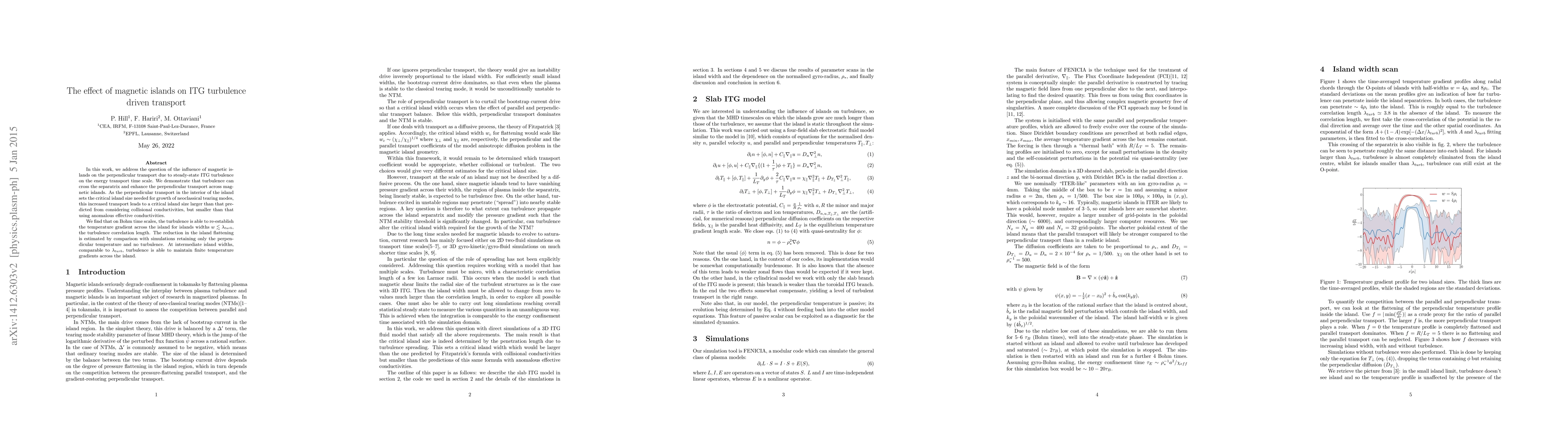This research investigates how magnetic islands affect perpendicular transport driven by ITG turbulence, finding that turbulence enhances transport across these islands, leading to a critical island size larger than predicted by collisional conductivities but smaller than with anomalous effective conductivities. The turbulence can re-establish temperature gradients across islands when their widths are comparable to the turbulence correlation length.
