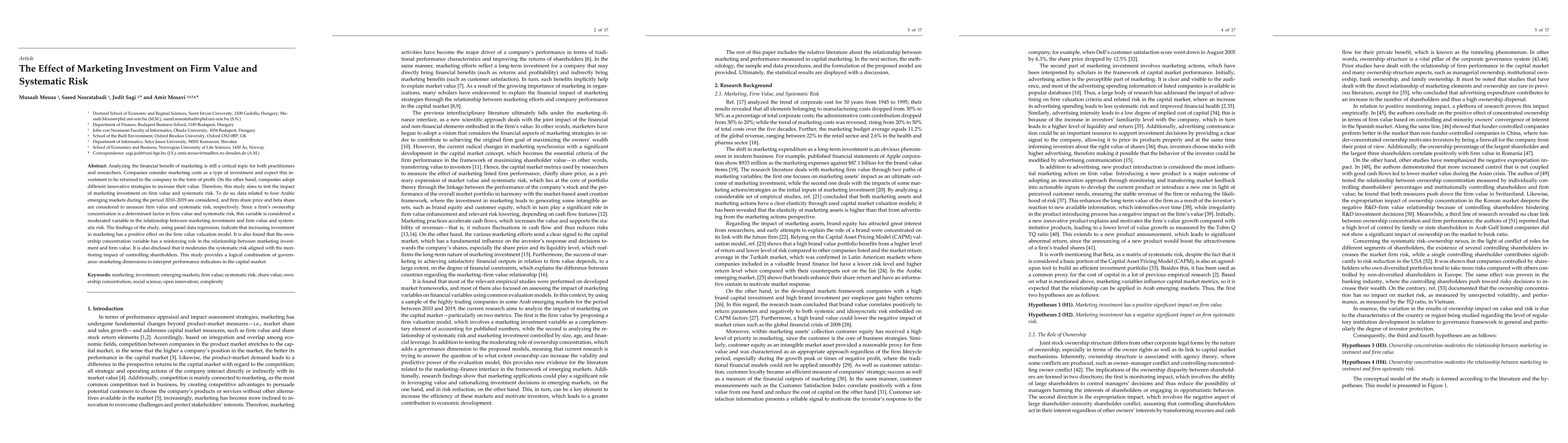 This study investigates the impact of marketing investment on firm value and systematic risk in four Arabic emerging markets from 2010 to 2019. Findings reveal a positive effect of marketing investment on firm value, with ownership concentration reinforcing this relationship and moderating the systematic risk.