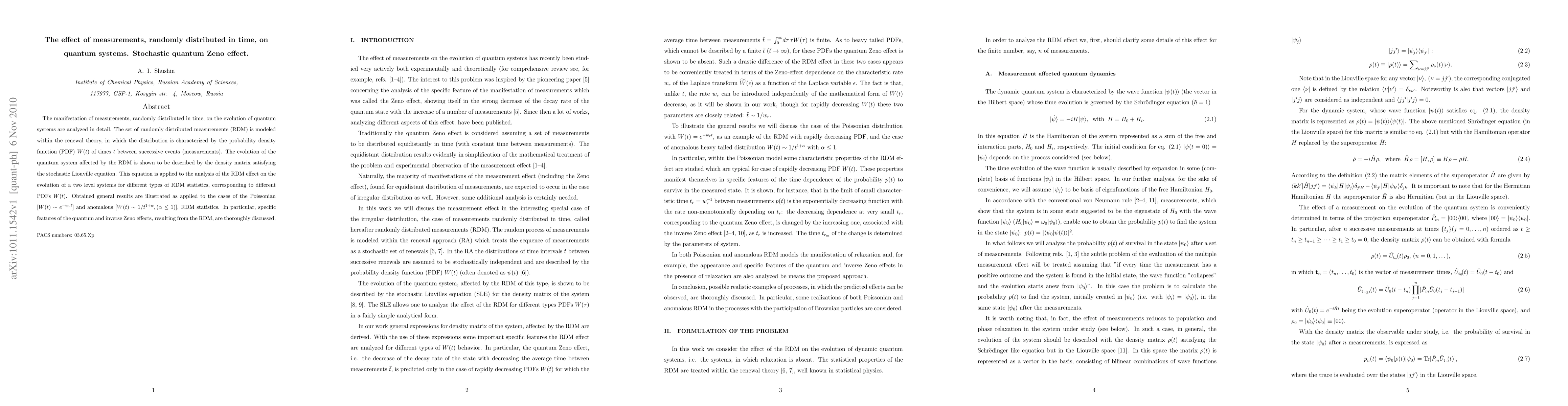 The manifestation of measurements, randomly distributed in time, on the evolution of quantum systems are analyzed in detail. The set of randomly distributed measurements (RDM) is modeled within the renewal theory, in which the distribution is characterized by the probability density function (PDF) W(t) of times t between successive events (measurements). The evolution of the quantum system affected by the RDM is shown to be described by the density matrix satisfying the stochastic Liouville equation. This equation is applied to the analysis of the RDM effect on the evolution of a two level systems for different types of RDM statistics, corresponding to different PDFs W(t). Obtained general results are illustrated as applied to the cases of the Poissonian [W(t) ~ e^{-w_r t}] and anomalous [W(t) ~ 1/t^{1+\alpha}, (\alpha is smaller or equal to 1)], RDM statistics. In particular, specific features of the quantum and inverse Zeno effects, resulting from the RDM, are thoroughly discussed.