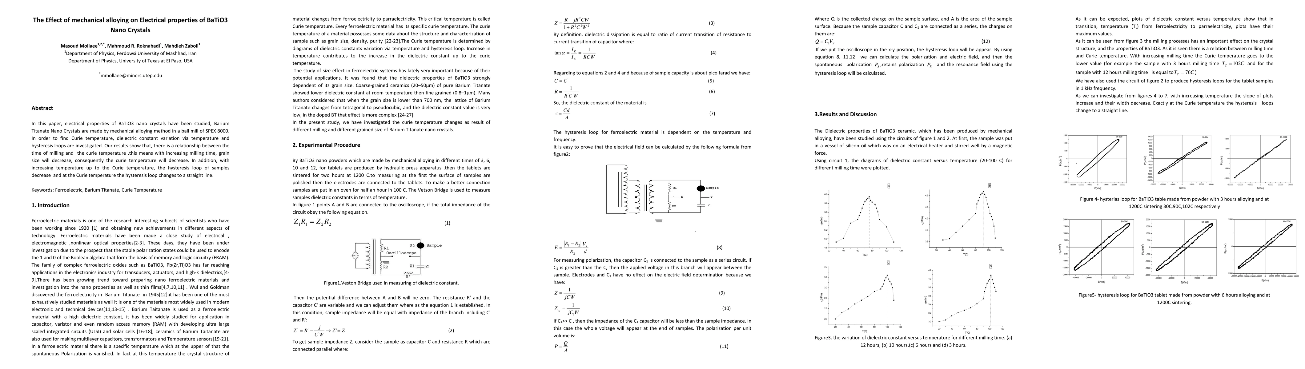 This study investigates the impact of mechanical alloying on BaTiO3 nano crystals' electrical properties. Results indicate a correlation between milling time and Curie temperature, showing that increased milling reduces grain size and Curie temperature. As temperature approaches Curie temperature, hysteresis loops diminish and transform into straight lines.