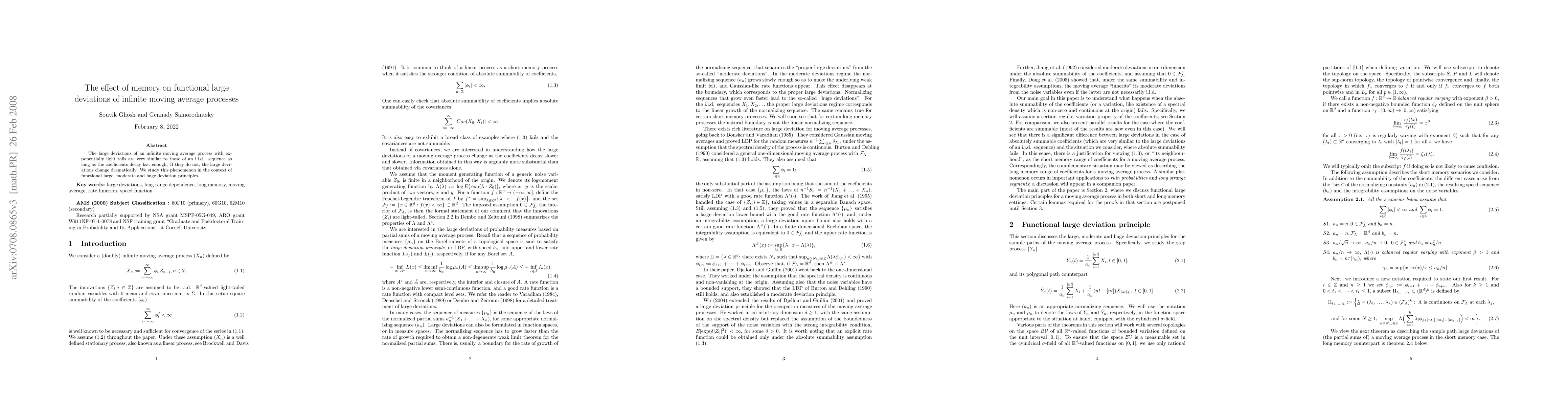 The large deviations of an infinite moving average process with exponentially light tails are very similar to those of an i.i.d. sequence as long as the coefficients decay fast enough. If they do not, the large deviations change dramatically. We study this phenomenon in the context of functional large, moderate and huge deviation principles.