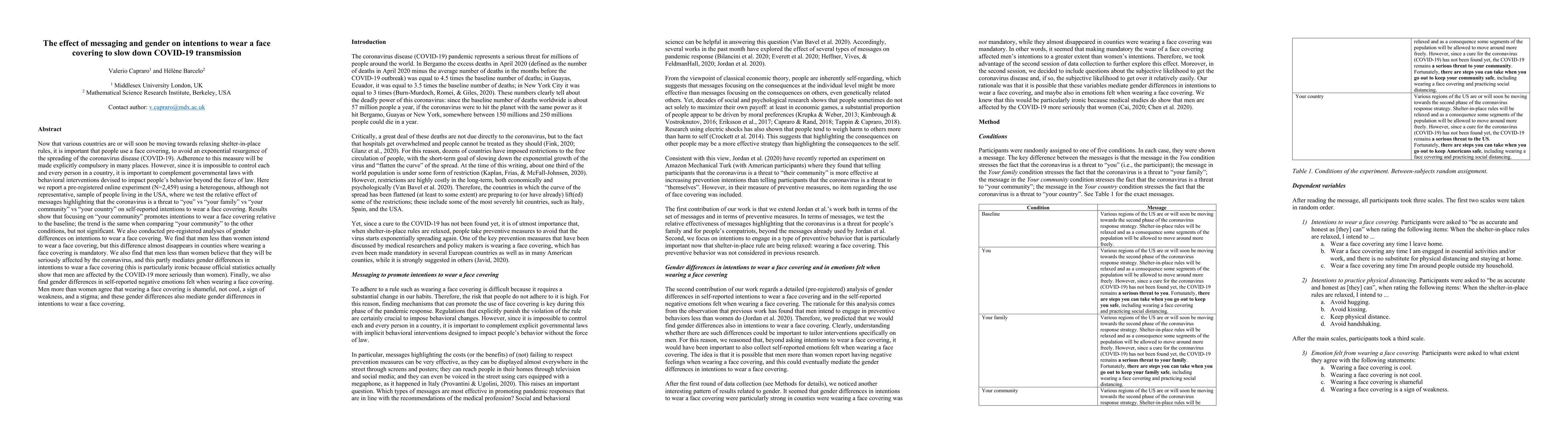 Now that various countries are or will soon be moving towards relaxing shelter-in-place rules, it is important that people use a face covering, to avoid an exponential resurgence of the spreading of the coronavirus disease (COVID-19). Here we report a pre-registered online experiment (N=2,459) using a heterogenous, although not representative, sample of people living in the USA, where we test the relative effect of messages highlighting that the coronavirus is a threat to "you" vs "your family" vs "your community" vs "your country" on self-reported intentions to wear a face covering. Results show that focusing on "your community" promotes intentions to wear a face covering relative to the baseline; the trend is the same when comparing "your community" to the other conditions, but not significant. We also conducted pre-registered analyses of gender differences on intentions to wear a face covering. We find that men less than women intend to wear a face covering, but this difference almost disappears in counties where wearing a face covering is mandatory. We also find that men less than women believe that they will be seriously affected by the coronavirus, and this partly mediates gender differences in intentions to wear a face covering (this is particularly ironic because official statistics actually show that men are affected by the COVID-19 more seriously than women). Finally, we also find gender differences in self-reported negative emotions felt when wearing a face covering. Men more than women agree that wearing a face covering is shameful, not cool, a sign of weakness, and a stigma; and these gender differences also mediate gender differences in intentions to wear a face covering.