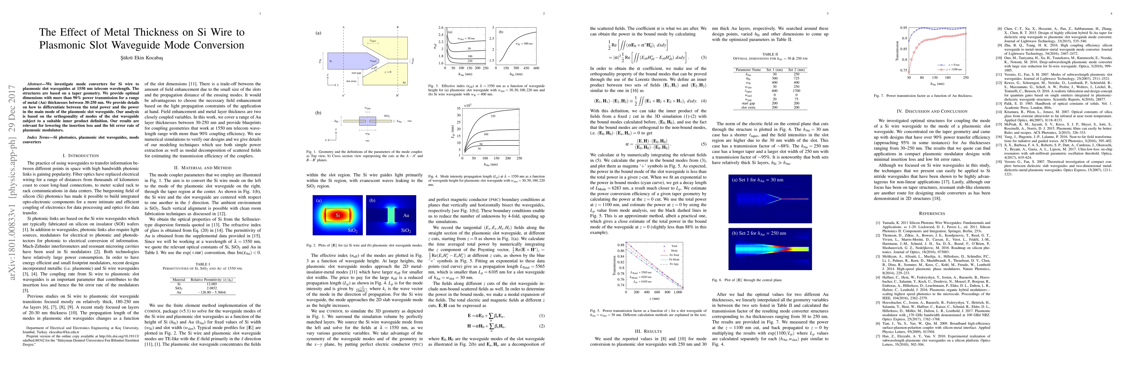 This research investigates mode converters for Si wire to plasmonic slot waveguides, achieving over 90% power transmission at 1550 nm with optimal taper geometries and metal thicknesses ranging from 30-250 nm. The study differentiates total power from main mode power, relevant for reducing insertion loss and bit error rates in plasmonic modulators.