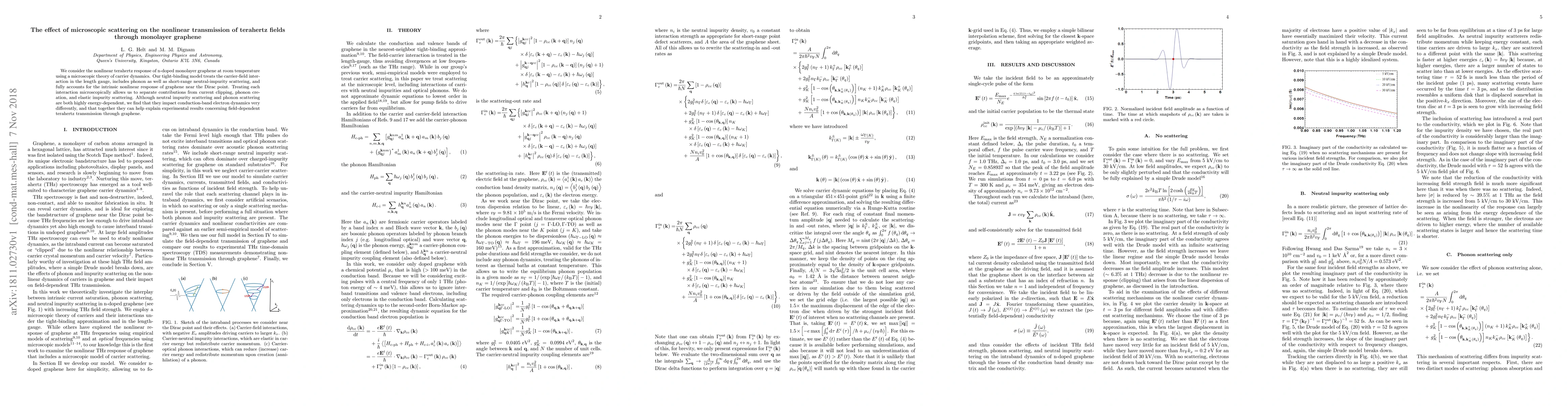 We consider the nonlinear terahertz response of n-doped monolayer graphene at room temperature using a microscopic theory of carrier dynamics. Our tight-binding model treats the carrier-field interaction in the length gauge, includes phonon as well as short-range neutral-impurity scattering, and fully accounts for the intrinsic nonlinear response of graphene near the Dirac point. Treating each interaction microscopically allows us to separate contributions from current clipping, phonon creation, and elastic impurity scattering. Although neutral impurity scattering and phonon scattering are both highly energy-dependent, we find that they impact conduction-band electron dynamics very differently, and that together they can help explain experimental results concerning field-dependent terahertz transmission through graphene.