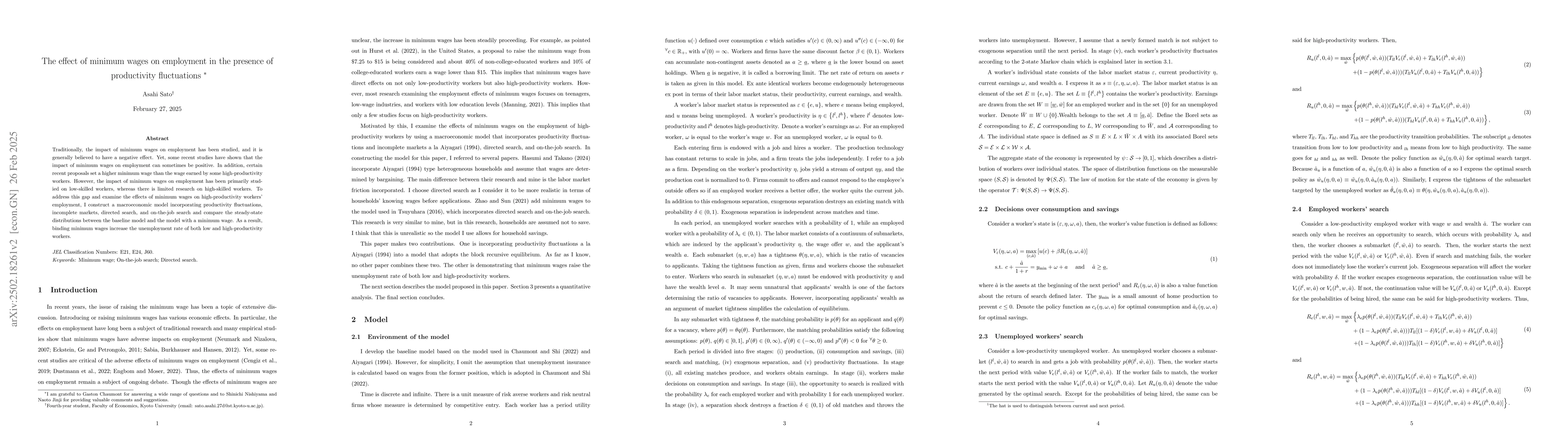 The paper develops a novel macroeconomic model that integrates productivity fluctuations, incomplete markets, directed search, and on-the-job search to study minimum wage effects on employment for both low and high-productivity workers.