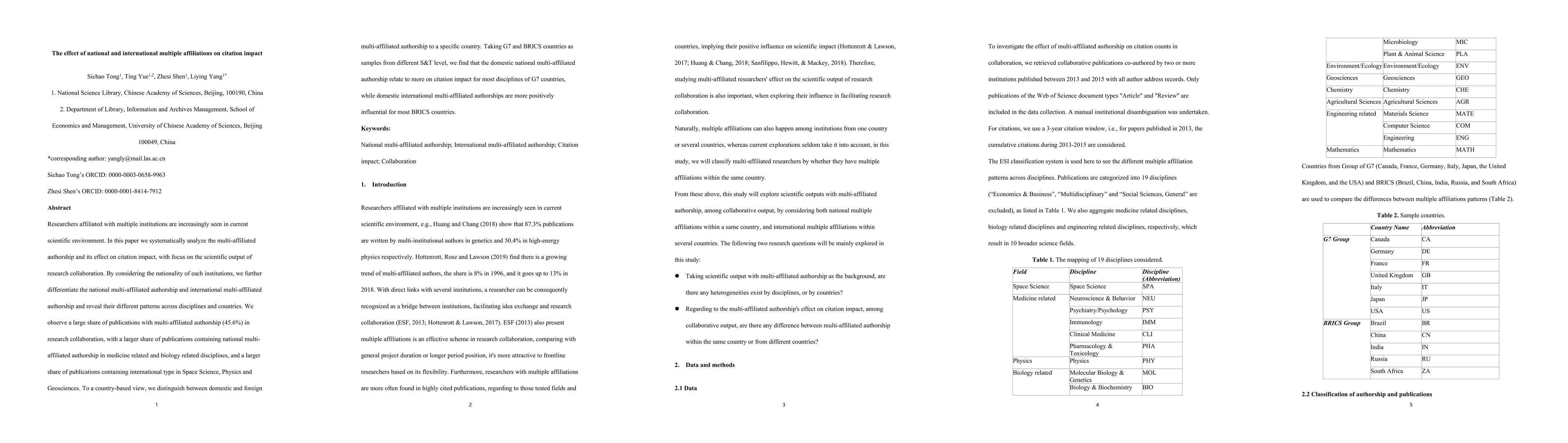 This paper investigates how multiple institutional affiliations impact citation impact, distinguishing between national and international multi-affiliations. It finds that national affiliations tend to boost citation impact in G7 countries, while international affiliations are more beneficial for BRICS countries, with varying effects across different disciplines.