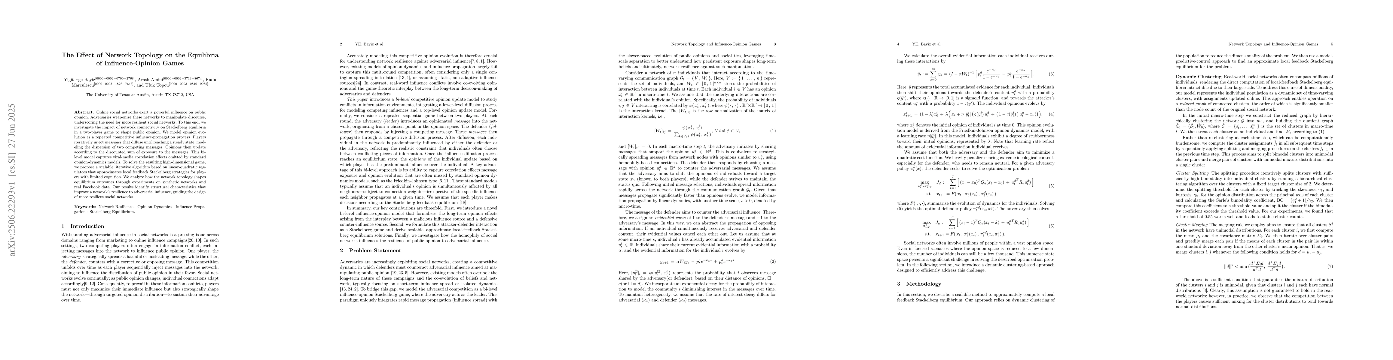 The paper introduces a bi-level influence-opinion game model to study the effect of network topology on adversarial information operations in social networks. It formulates the problem as a Stackelberg game and presents a scalable algorithm using dynamic clustering and model-predictive control to approximate local feedback Stackelberg equilibria for players with limited cognition.