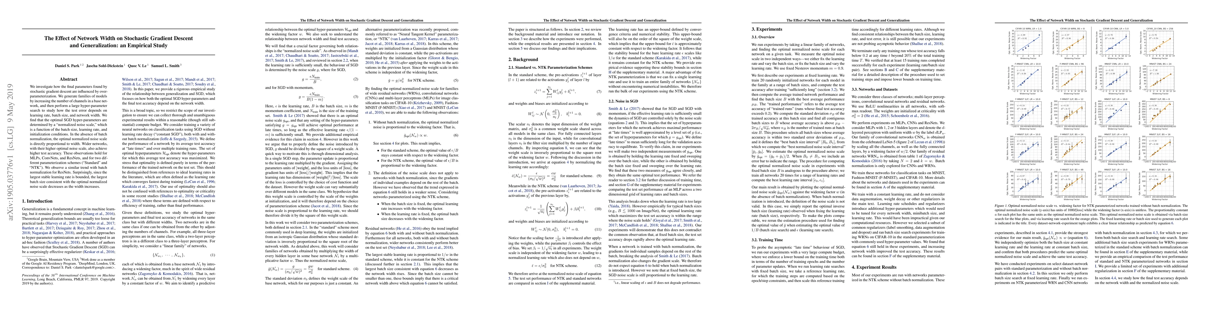 We investigate how the final parameters found by stochastic gradient descent are influenced by over-parameterization. We generate families of models by increasing the number of channels in a base network, and then perform a large hyper-parameter search to study how the test error depends on learning rate, batch size, and network width. We find that the optimal SGD hyper-parameters are determined by a "normalized noise scale," which is a function of the batch size, learning rate, and initialization conditions. In the absence of batch normalization, the optimal normalized noise scale is directly proportional to width. Wider networks, with their higher optimal noise scale, also achieve higher test accuracy. These observations hold for MLPs, ConvNets, and ResNets, and for two different parameterization schemes ("Standard" and "NTK"). We observe a similar trend with batch normalization for ResNets. Surprisingly, since the largest stable learning rate is bounded, the largest batch size consistent with the optimal normalized noise scale decreases as the width increases.