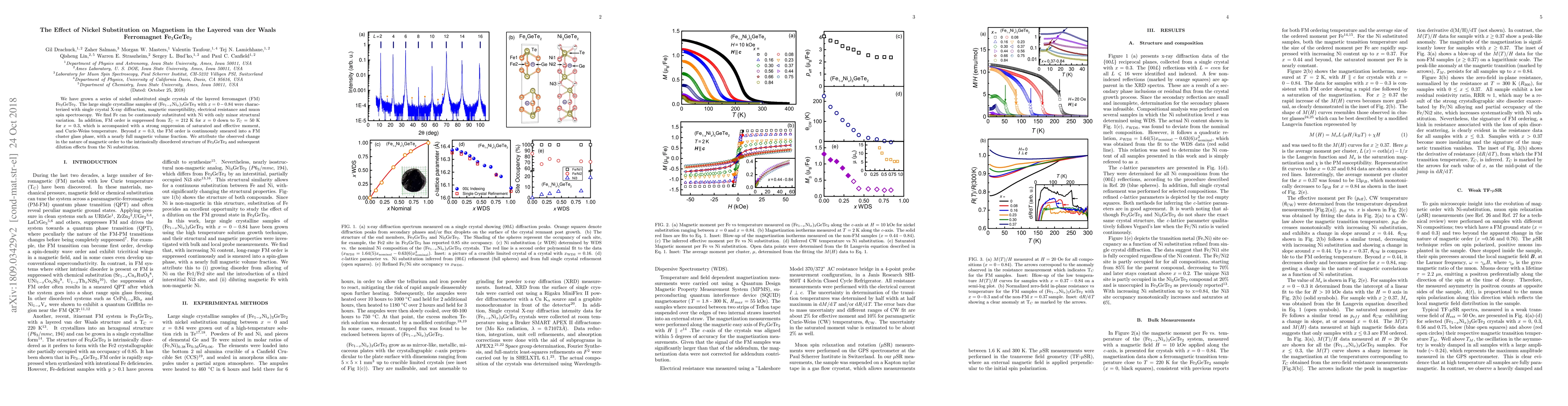 This study investigates the impact of nickel substitution on the magnetism of Fe$_3$GeTe$_2$, finding that Fe can be continuously replaced by Ni with minimal structural changes. The ferromagnetic order diminishes from 212 K to 50 K as Ni concentration increases, transitioning into a ferromagnetic cluster glass phase beyond 0.3 Ni substitution.