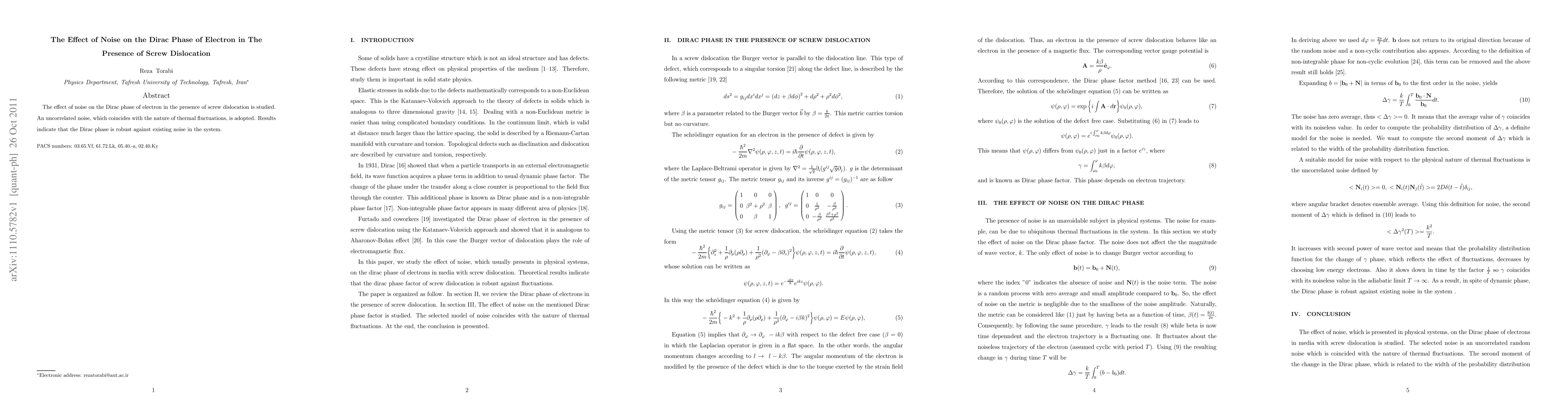 Summary: This study investigates how thermal noise affects the Dirac phase of an electron near a screw dislocation. Despite the presence of uncorrelated noise, the Dirac phase remains robust, indicating minimal disruption from thermal fluctuations.