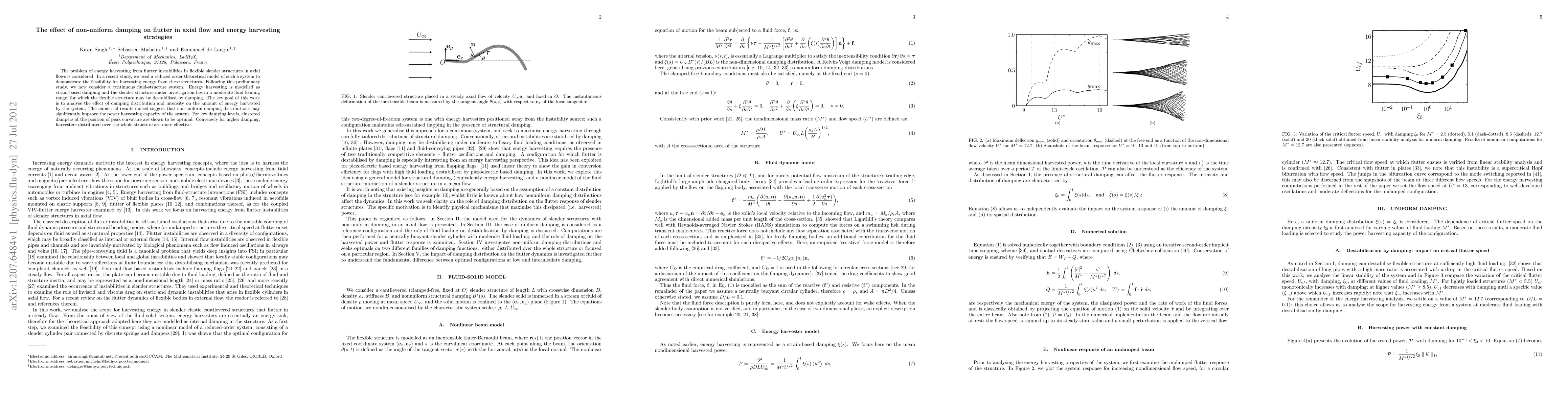 The problem of energy harvesting from flutter instabilities in flexible slender structures in axial flows is considered. In a recent study, we used a reduced order theoretical model of such a system to demonstrate the feasibility for harvesting energy from these structures. Following this preliminary study, we now consider a continuous fluid-structure system. Energy harvesting is modelled as strain-based damping and the slender structure under investigation lies in a moderate fluid loading range, for which {the flexible structure} may be destabilised by damping. The key goal of this work is to {analyse the effect of damping distribution and intensity on the amount of energy harvested by the system}. The numerical results {indeed} suggest that non-uniform damping distributions may significantly improve the power harvesting capacity of the system. For low damping levels, clustered dampers at the position of peak curvature are shown to be optimal. Conversely for higher damping, harvesters distributed over the whole structure are more effective.