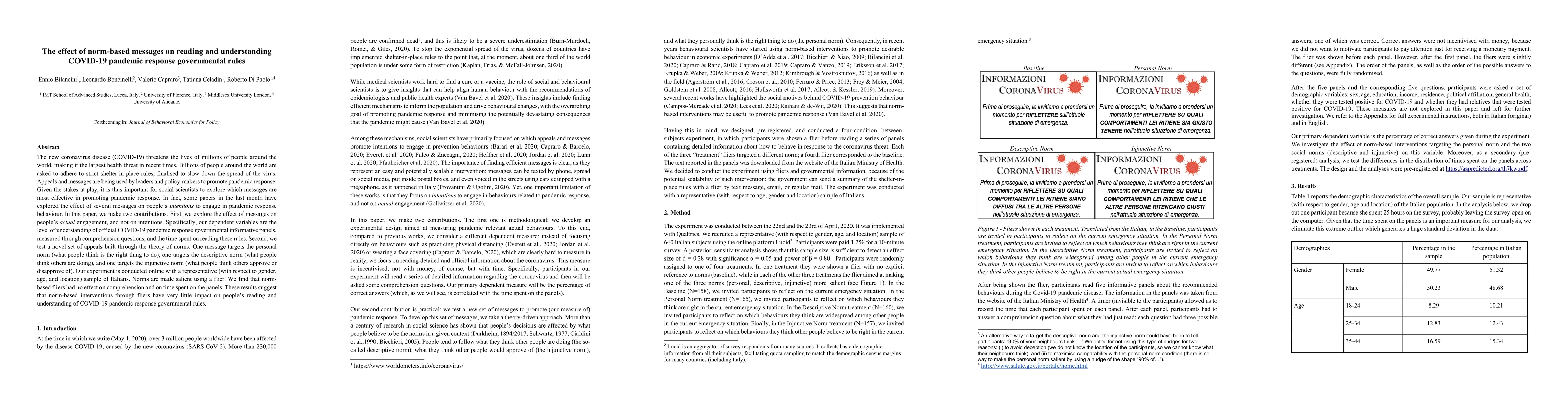 The new coronavirus disease (COVID-19) threatens the lives of millions of people around the world, making it the largest health threat in recent times. Billions of people around the world are asked to adhere to strict shelter-in-place rules, finalised to slow down the spread of the virus. Appeals and messages are being used by leaders and policy-makers to promote pandemic response. Given the stakes at play, it is thus important for social scientists to explore which messages are most effective in promoting pandemic response. In fact, some papers in the last month have explored the effect of several messages on people's intentions to engage in pandemic response behaviour. In this paper, we make two contributions. First, we explore the effect of messages on people's actual engagement, and not on intentions. Specifically, our dependent variables are the level of understanding of official COVID-19 pandemic response governmental informative panels, measured through comprehension questions, and the time spent on reading these rules. Second, we test a novel set of appeals built through the theory of norms. One message targets the personal norm (what people think is the right thing to do), one targets the descriptive norm (what people think others are doing), and one targets the injunctive norm (what people think others approve or disapprove of). Our experiment is conducted online with a representative (with respect to gender, age, and location) sample of Italians. Norms are made salient using a flier. We find that norm-based fliers had no effect on comprehension and on time spent on the panels. These results suggest that norm-based interventions through fliers have very little impact on people's reading and understanding of COVID-19 pandemic response governmental rules.