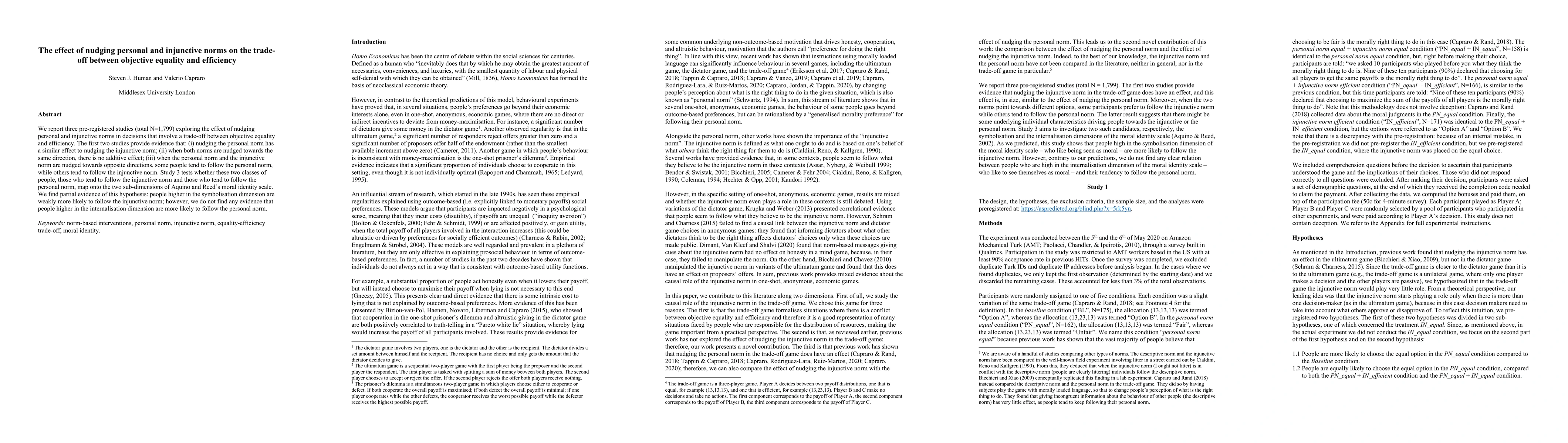 We report three pre-registered studies (total N=1,799) exploring the effect of nudging personal and injunctive norms in decisions that involve a trade-off between objective equality and efficiency. The first two studies provide evidence that: (i) nudging the personal norm has a similar effect to nudging the injunctive norm; (ii) when both norms are nudged towards the same direction, there is no additive effect; (iii) when the personal norm and the injunctive norm are nudged towards opposite directions, some people tend to follow the personal norm, while others tend to follow the injunctive norm. Study 3 tests whether these two classes of people, those who tend to follow the injunctive norm and those who tend to follow the personal norm, map onto the two sub-dimensions of Aquino and Reed's moral identity scale. We find partial evidence of this hypothesis: people higher in the symbolisation dimension are weakly more likely to follow the injunctive norm; however, we do not find any evidence that people higher in the internalisation dimension are more likely to follow the personal norm.