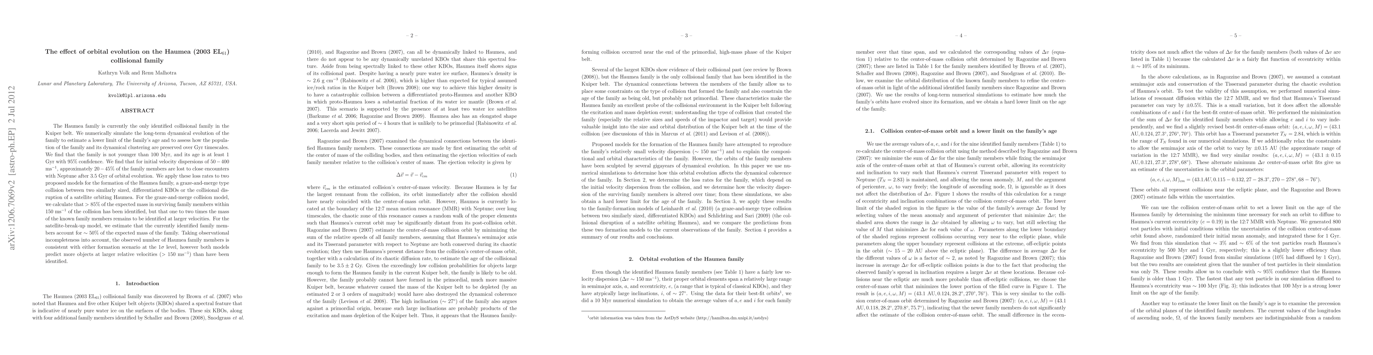 The Haumea family is currently the only identified collisional family in the Kuiper belt. We numerically simulate the long-term dynamical evolution of the family to estimate a lower limit of the family's age and to assess how the population of the family and its dynamical clustering are preserved over Gyr timescales. We find that the family is not younger than 100 Myr, and its age is at least 1 Gyr with 95% confidence. We find that for initial velocity dispersions of 50-400 m/s, approximately 20-45% of the family members are lost to close encounters with Neptune after 3.5 Gyr of orbital evolution. We apply these loss rates to two proposed models for the formation of the Haumea family, a graze-and-merge type collision between two similarly sized, differentiated KBOs or the collisional disruption of a satellite orbiting Haumea. For the graze-and-merge collision model, we calculate that >85% of the expected mass in surviving family members within 150 m/s of the collision has been identified, but that one to two times the mass of the known family members remains to be identified at larger velocities. For the satellite-break-up model, we estimate that the currently identified family members account for ~50% of the expected mass of the family. Taking observational incompleteness into account, the observed number of Haumea family members is consistent with either formation scenario at the 1 sigma level, however both models predict more objects at larger relative velocities (>150 m/s) than have been identified.