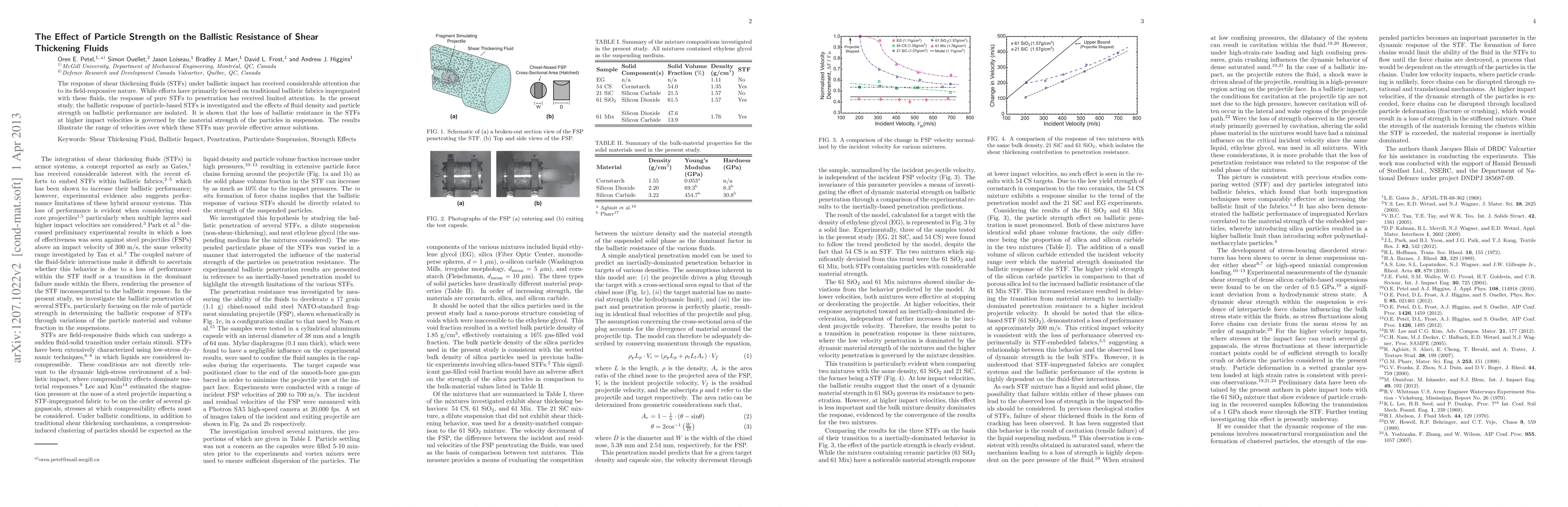 The study investigates the ballistic penetration of several shear thickening fluids (STFs) by varying particle material and volume fraction in the suspensions, using an inertially-based penetration model to evaluate the strength limitations of various STFs.