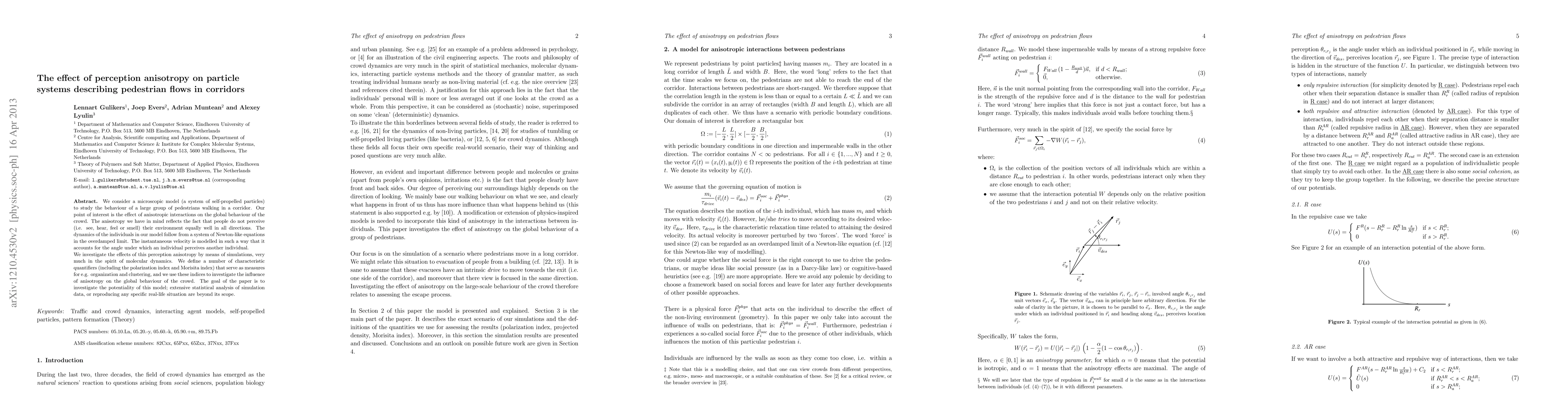 We consider a microscopic model (a system of self-propelled particles) to study the behaviour of a large group of pedestrians walking in a corridor. Our point of interest is the effect of anisotropic interactions on the global behaviour of the crowd. The anisotropy we have in mind reflects the fact that people do not perceive (i.e. see, hear, feel or smell) their environment equally well in all directions. The dynamics of the individuals in our model follow from a system of Newton-like equations in the overdamped limit. The instantaneous velocity is modelled in such a way that it accounts for the angle under which an individual perceives another individual. We investigate the effects of this perception anisotropy by means of simulations, very much in the spirit of molecular dynamics. We define a number of characteristic quantifiers (including the polarization index and Morisita index) that serve as measures for e.g. organization and clustering, and we use these indices to investigate the influence of anisotropy on the global behaviour of the crowd. The goal of the paper is to investigate the potentiality of this model; extensive statistical analysis of simulation data, or reproducing any specific real-life situation are beyond its scope.