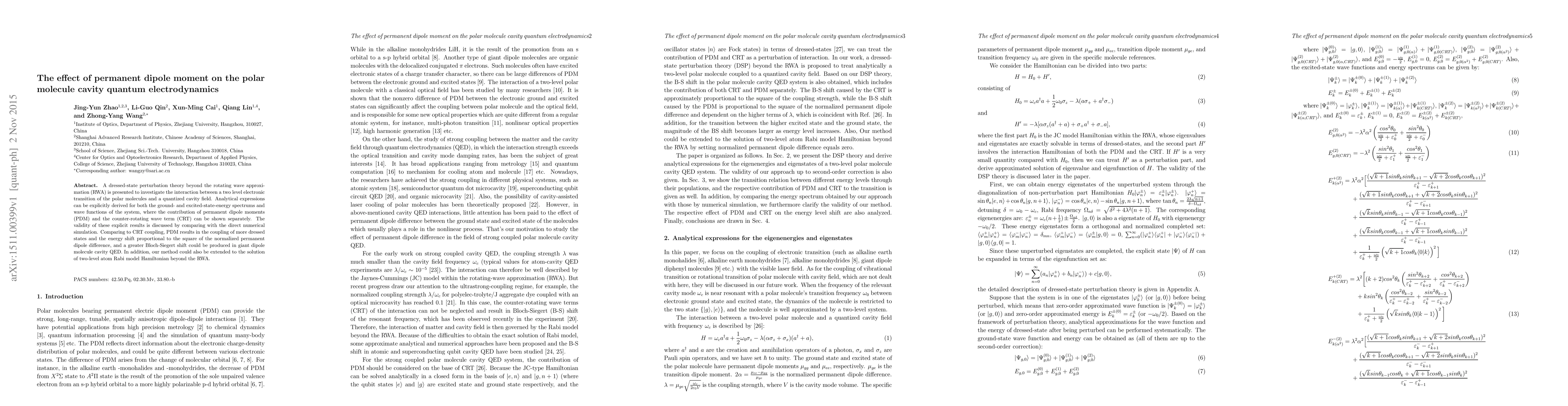 This paper employs a dressed-state perturbation theory to study the interaction between polar molecules and a quantized cavity field, deriving analytical expressions for the energy spectrums and wave functions. It highlights that permanent dipole moments lead to more dressed states and a greater Bloch-Siegert shift compared to counter-rotating wave coupling.