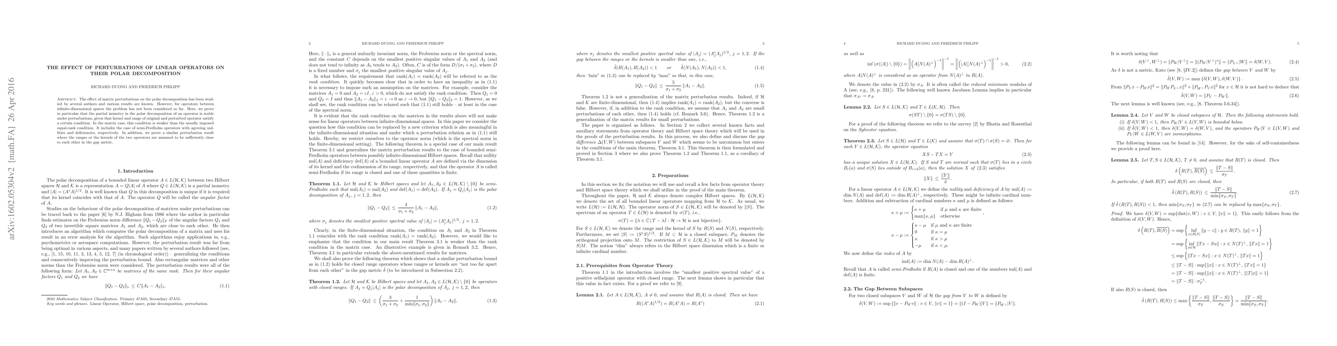 The effect of matrix perturbations on the polar decomposition has been studied by several authors and various results are known. However, for operators between infinite-dimensional spaces the problem has not been considered so far. Here, we prove in particular that the partial isometry in the polar decomposition of an operator is stable under perturbations, given that kernel and range of original and perturbed operator satisfy a certain condition. In the matrix case, this condition is weaker than the usually imposed equal-rank condition. It includes the case of semi-Fredholm operators with agreeing nullities and deficiencies, respectively. In addition, we prove a similar perturbation result where the ranges or the kernels of the two operators are assumed to be sufficiently close to each other in the gap metric.