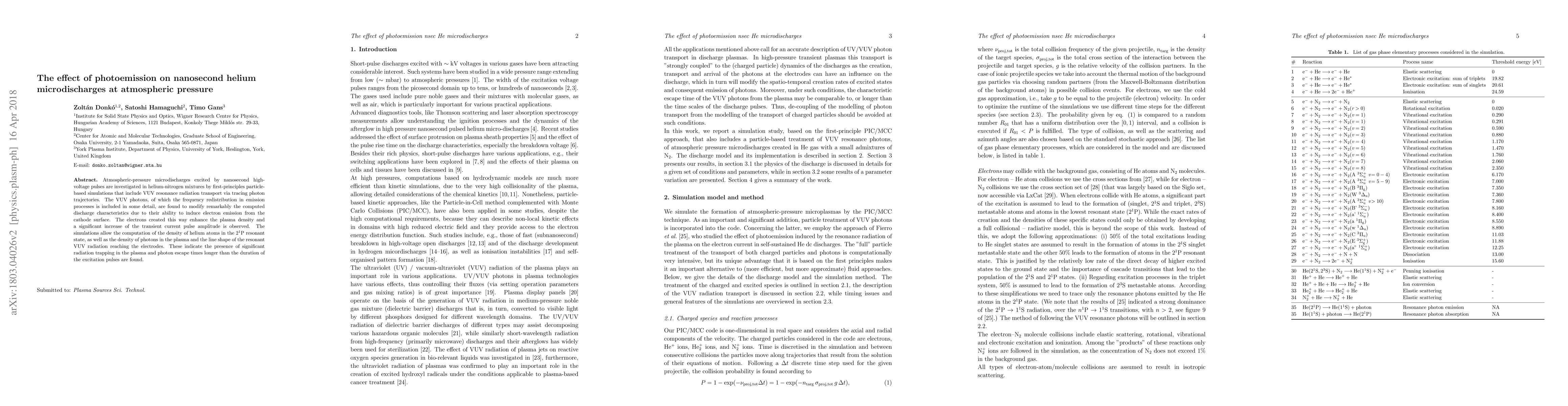 This study investigates nanosecond helium microdischarges at atmospheric pressure using particle-based simulations, revealing that VUV photons induce electron emission from the cathode, enhancing plasma density and increasing transient current pulse amplitude. The simulations also show significant radiation trapping and longer photon escape times than pulse durations.