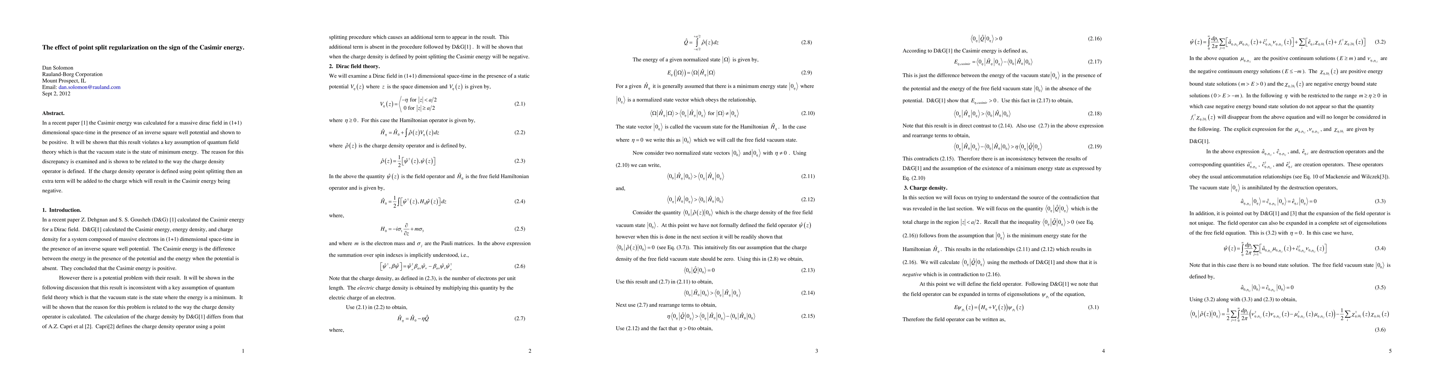In a recent paper [1] the Casimir energy was calculated for a massive dirac field in (1+1) dimensional space-time in the presence of an inverse square well potential and shown to be positive. It will be shown that this result violates a key assumption of quantum field theory which is that the vacuum state is the state of minimum energy. The reason for this discrepancy is examined and is shown to be related to the way the charge density operator is defined. If the charge density operator is defined using point splitting then an extra term will be added to the charge which will result in the Casimir energy being negative.