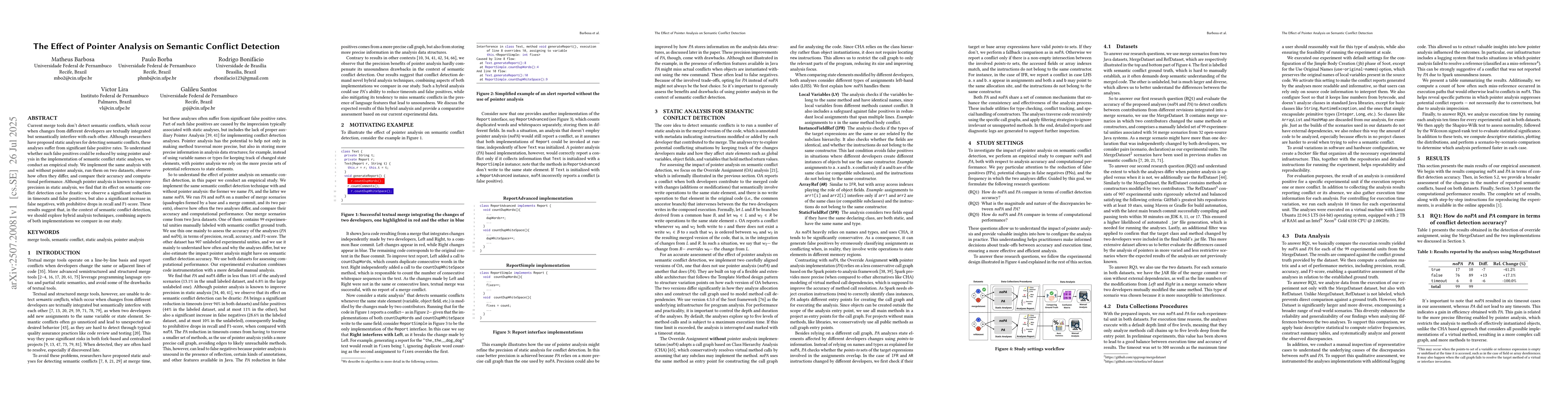 Current merge tools don't detect semantic conflicts, which occur when changes from different developers are textually integrated but semantically interfere with each other. Although researchers have proposed static analyses for detecting semantic conflicts, these analyses suffer from significant false positive rates. To understand whether such false positives could be reduced by using pointer analysis in the implementation of semantic conflict static analyses, we conduct an empirical study. We implement the same analysis with and without pointer analysis, run them on two datasets, observe how often they differ, and compare their accuracy and computational performance. Although pointer analysis is known to improve precision in static analysis, we find that its effect on semantic conflict detection can be drastic: we observe a significant reduction in timeouts and false positives, but also a significant increase in false negatives, with prohibitive drops in recall and F1-score. These results suggest that, in the context of semantic conflict detection, we should explore hybrid analysis techniques, combining aspects of both implementations we compare in our study.