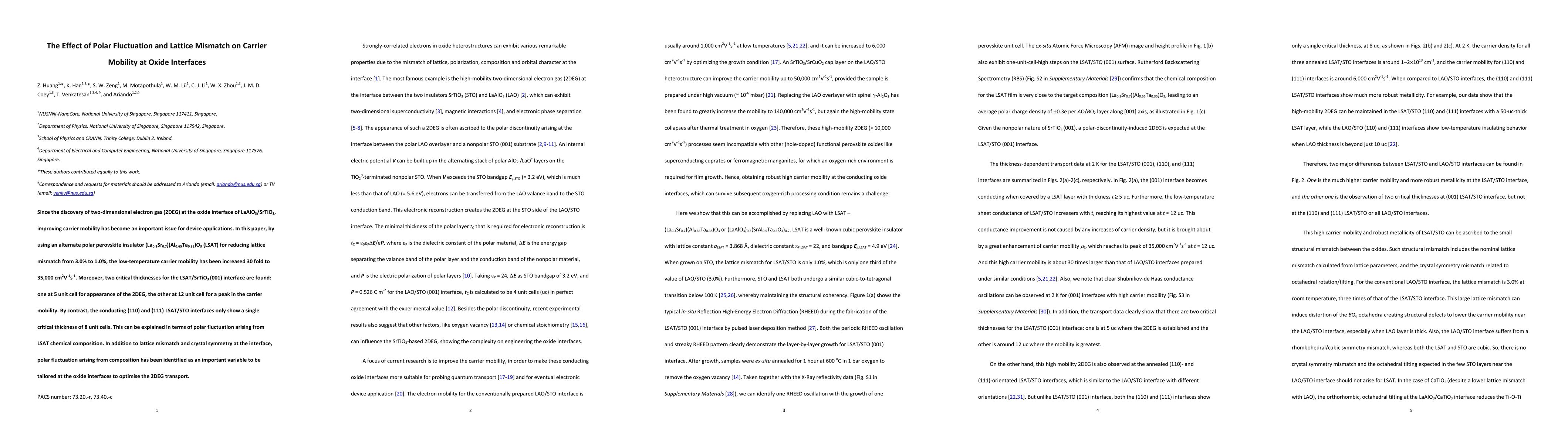 This paper investigates how polar fluctuation and lattice mismatch influence carrier mobility at oxide interfaces, demonstrating a 30-fold increase in low-temperature mobility by using LSAT to reduce lattice mismatch. Critical thicknesses for optimal 2DEG transport are identified, highlighting the significance of polar fluctuation from chemical composition in optimizing electron gas transport.