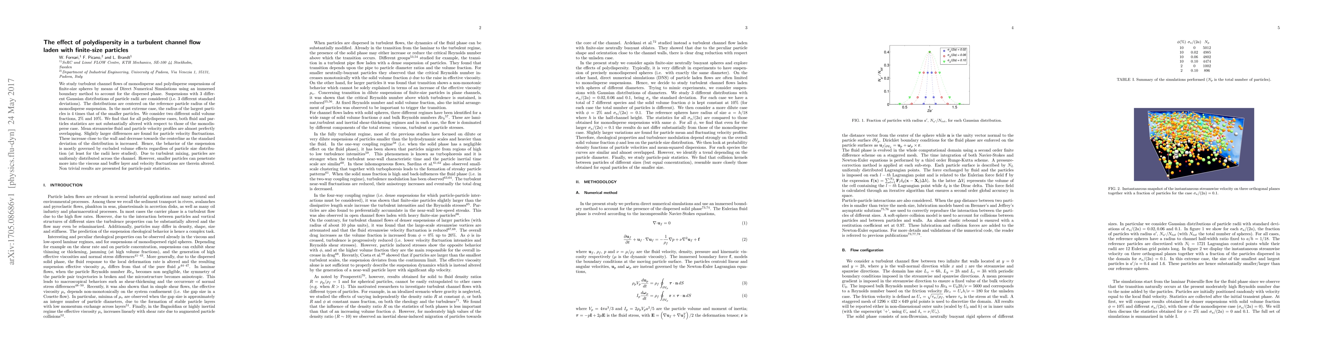 We study turbulent channel flows of monodisperse and polydisperse suspensions of finite-size spheres by means of Direct Numerical Simulations using an immersed boundary method to account for the dispersed phase. Suspensions with 3 different Gaussian distributions of particle radii are considered (i.e. 3 different standard deviations). The distributions are centered on the reference particle radius of the monodisperse suspension. In the most extreme case, the radius of the largest particles is 4 times that of the smaller particles. We consider two different solid volume fractions, 2% and 10%. We find that for all polydisperse cases, both fluid and particles statistics are not substantially altered with respect to those of the monodisperse case. Mean streamwise fluid and particle velocity profiles are almost perfectly overlapping. Slightly larger differences are found for particle velocity fluctuations. These increase close to the wall and decrease towards the centerline as the standard deviation of the distribution is increased. Hence, the behavior of the suspension is mostly governed by excluded volume effects regardless of particle size distribution (at least for the radii here studied). Due to turbulent mixing, particles are uniformly distributed across the channel. However, smaller particles can penetrate more into the viscous and buffer layer and velocity fluctuations are therein altered. Non trivial results are presented for particle-pair statistics.