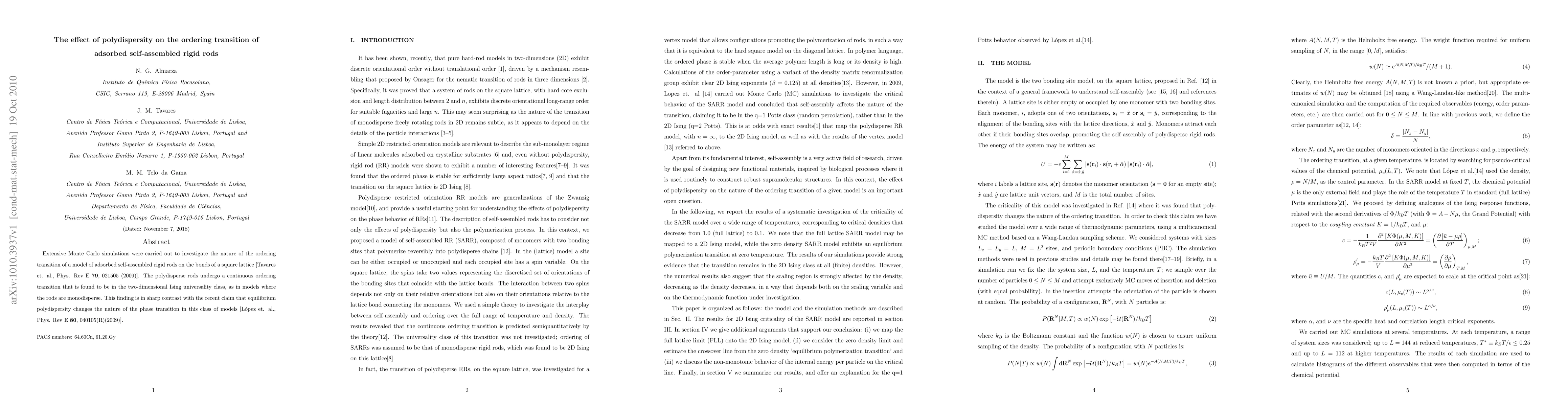 Extensive Monte Carlo simulations were carried out to investigate the nature of the ordering transition of a model of adsorbed self-assembled rigid rods on the bonds of a square lattice [Tavares et. al., Phys. Rev E 79, 021505 (2009)]. The polydisperse rods undergo a continuous ordering transition that is found to be in the two-dimensional Ising universality class, as in models where the rods are monodisperse. This finding is in sharp contrast with the recent claim that equilibrium polydispersity changes the nature of the phase transition in this class of models [L`opez et. al., Phys. Rev E 80, 040105(R)(2009)].