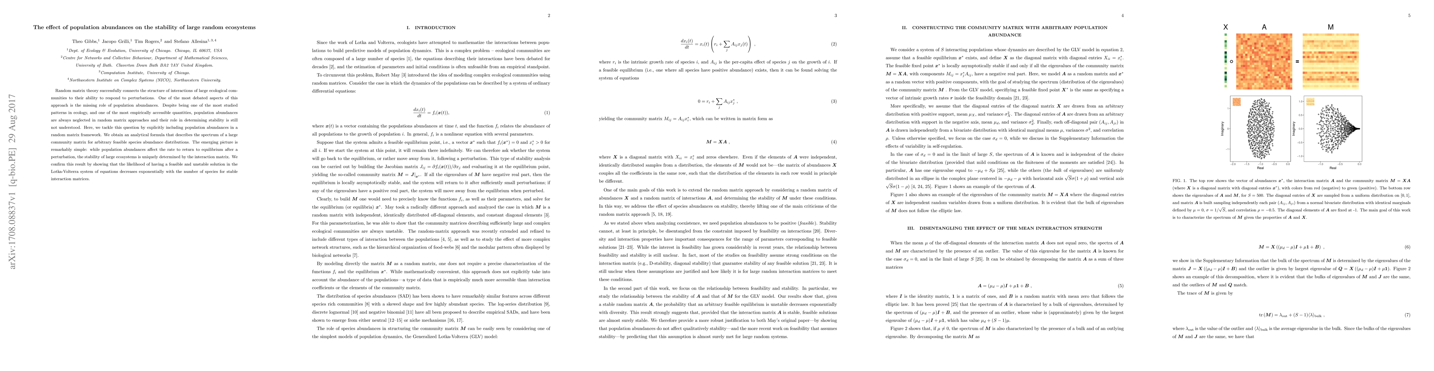 Random matrix theory successfully connects the structure of interactions of large ecological communities to their ability to respond to perturbations. One of the most debated aspects of this approach is the missing role of population abundances. Despite being one of the most studied patterns in ecology, and one of the most empirically accessible quantities, population abundances are always neglected in random matrix approaches and their role in determining stability is still not understood. Here, we tackle this question by explicitly including population abundances in a random matrix framework. We obtain an analytical formula that describes the spectrum of a large community matrix for arbitrary feasible species abundance distributions. The emerging picture is remarkably simple: while population abundances affect the rate to return to equilibrium after a perturbation, the stability of large ecosystems is uniquely determined by the interaction matrix. We confirm this result by showing that the likelihood of having a feasible and unstable solution in the Lotka-Volterra system of equations decreases exponentially with the number of species for stable interaction matrices.
