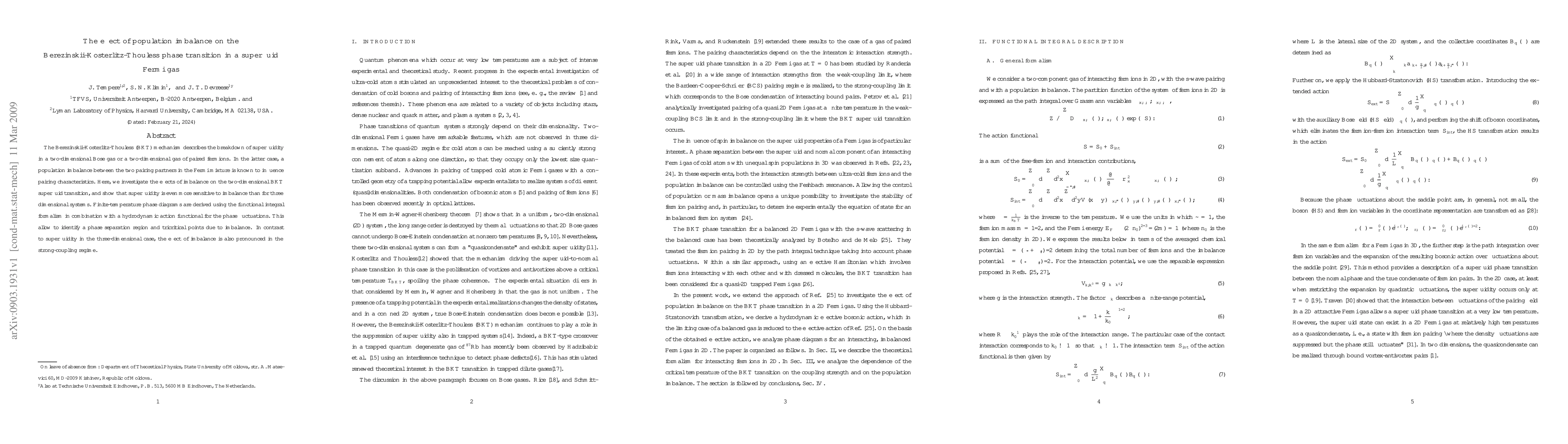 This paper investigates how population imbalance affects the Berezinskii-Kosterlitz-Thouless (BKT) phase transition in a two-dimensional superfluid Fermi gas, demonstrating that imbalance makes the transition even more sensitive than in three-dimensional systems. The study uses functional integral formalism and a hydrodynamic action to derive finite-temperature phase diagrams, revealing a phase separation region and tricritical points due to imbalance.