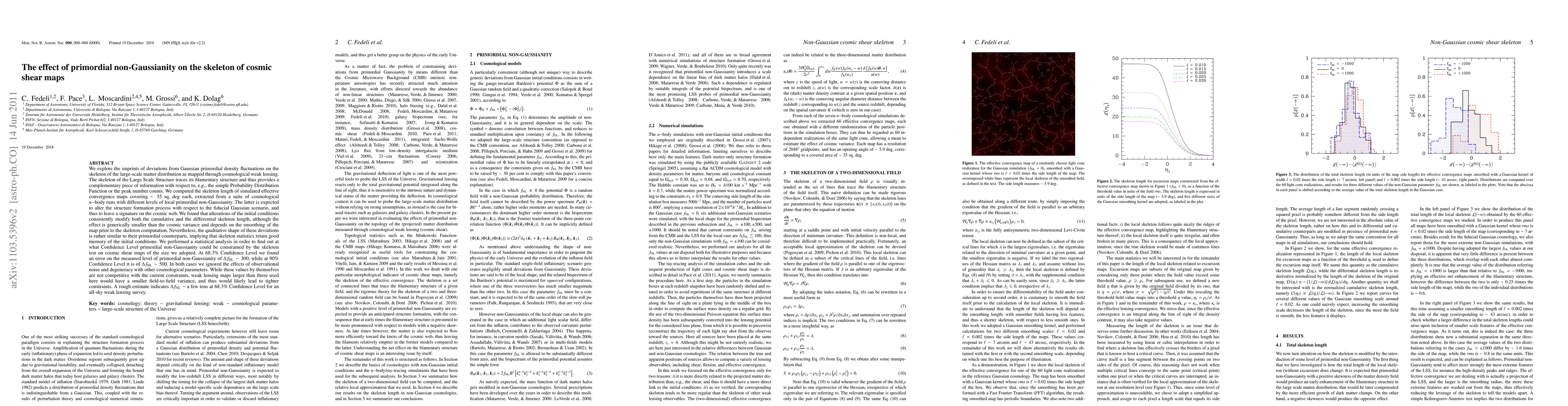 (abridged) We explore the imprints of deviations from Gaussian primordial density fluctuations on the skeleton of the large-scale matter distribution as mapped through cosmological weak lensing. We computed the skeleton length of simulated effective convergence maps covering $\sim 35$ sq. deg each, extracted from a suite of cosmological $n-$body runs with different levels of local primordial non-Gaussianity. The latter is expected to alter the structure formation process with respect to the fiducial Gaussian scenario, and thus to leave a signature on the cosmic web. We found that alterations of the initial conditions consistently modify both the cumulative and the differential skeleton length, although the effect is generically smaller than the cosmic variance and depends on the smoothing of the map prior to the skeleton computation. Nevertheless, the qualitative shape of these deviations is rather similar to their primordial counterparts, implying that skeleton statistics retain good memory of the initial conditions. We performed a statistical analysis in order to find out at what Confidence Level primordial non-Gaussianity could be constrained by the skeleton test on cosmic shear maps of the size we adopted. At 68.3% Confidence Level we found an error on the measured level of primordial non-Gaussianity of $\Delta f_\mathrm{NL}\sim 300$, while at 90% Confidence Level it is of $\Delta f_\mathrm{NL}\sim 500$. While these values by themselves are not competitive with the current constraints, weak lensing maps larger than those used here would have a smaller field-to-field variance, and thus would likely lead to tighter constraints. A rough estimate indicates $\Delta f_\mathrm{NL} \sim$ a few tens at 68.3% Confidence Level for an all-sky weak lensing survey.