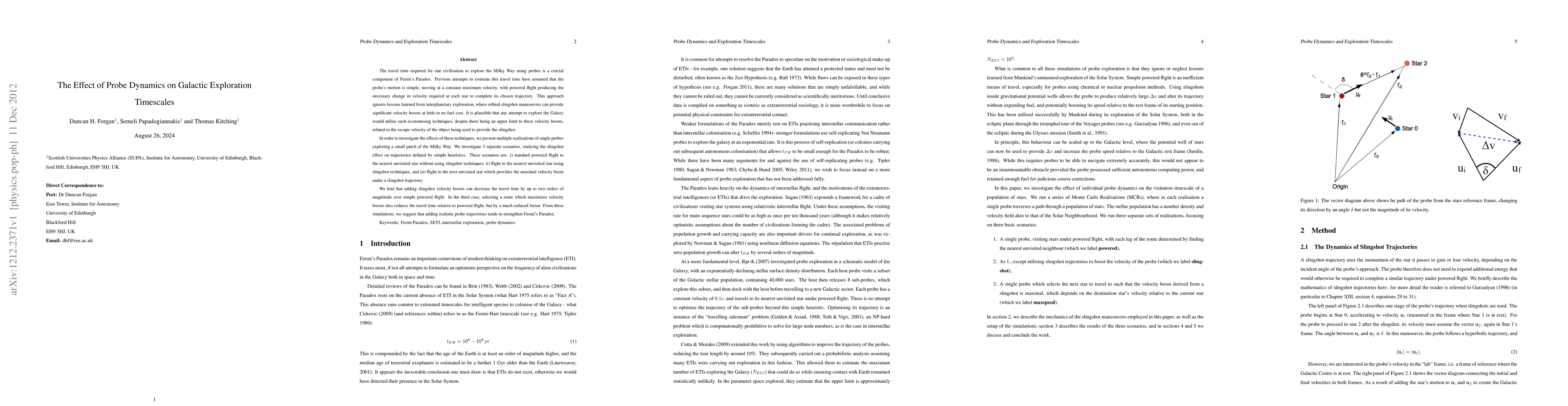 This paper investigates how probe dynamics, specifically using slingshot maneuvers, can significantly reduce travel times for galactic exploration, potentially up to two orders of magnitude compared to simple powered flight. The study suggests that incorporating realistic probe trajectories may further complicate the resolution of Fermi's Paradox.