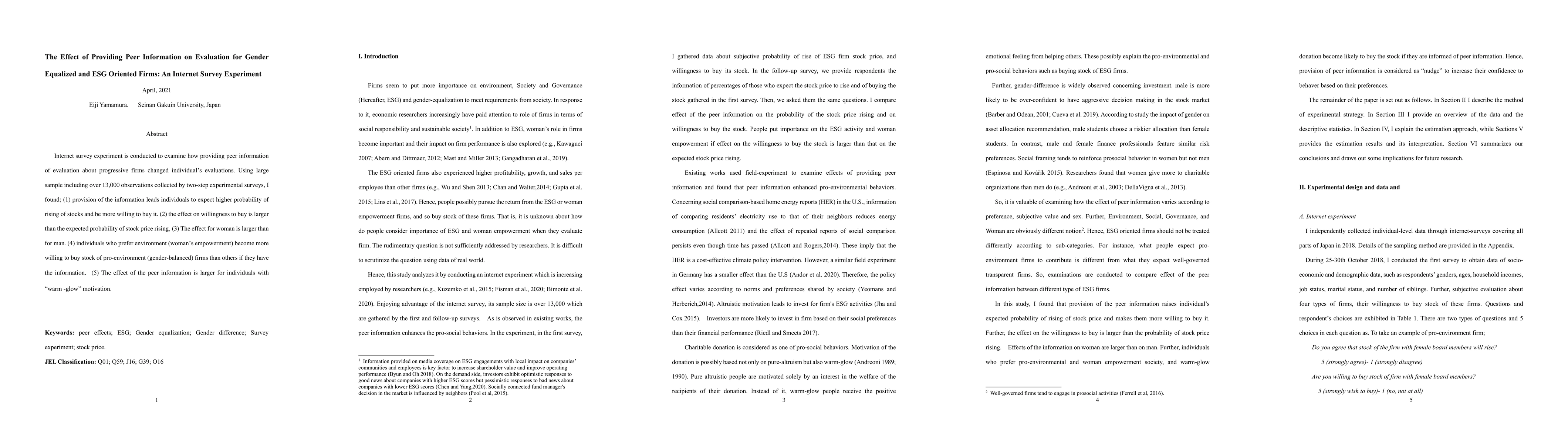 Internet survey experiment is conducted to examine how providing peer information of evaluation about progressive firms changed individual's evaluations. Using large sample including over 13,000 observations collected by two-step experimental surveys, I found; (1) provision of the information leads individuals to expect higher probability of rising of stocks and be more willing to buy it. (2) the effect on willingness to buy is larger than the expected probability of stock price rising, (3) The effect for woman is larger than for man. (4) individuals who prefer environment (woman's empowerment) become more willing to buy stock of pro-environment (gender-balanced) firms than others if they have the information. (5) The effect of the peer information is larger for individuals with "warm -glow" motivation.