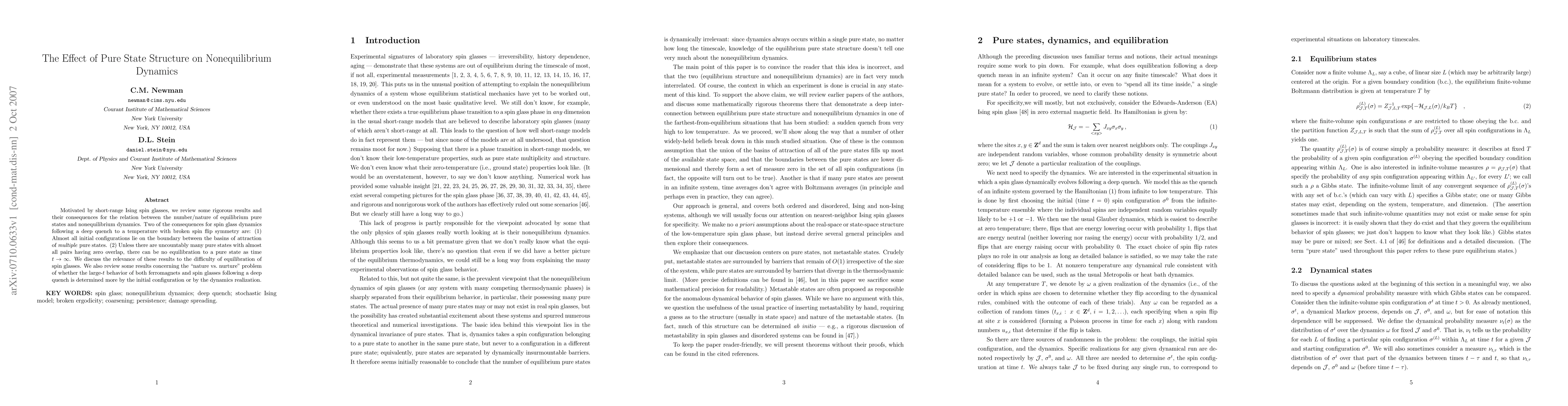 Motivated by short-range Ising spin glasses, we review some rigorous results and their consequences for the relation between the number/nature of equilibrium pure states and nonequilibrium dynamics. Two of the consequences for spin glass dynamics following a deep quench to a temperature with broken spin flip symmetry are: (1) Almost all initial configurations lie on the boundary between the basins of attraction of multiple pure states. (2) Unless there are uncountably many pure states with almost all pairs having zero overlap, there can be no equilibration to a pure state as time goes to infinity. We discuss the relevance of these results to the difficulty of equilibration of spin glasses. We also review some results concerning the ``nature vs. nurture'' problem of whether the large-time behavior of both ferromagnets and spin glasses following a deep quench is determined more by the initial configuration or by the dynamics realization.