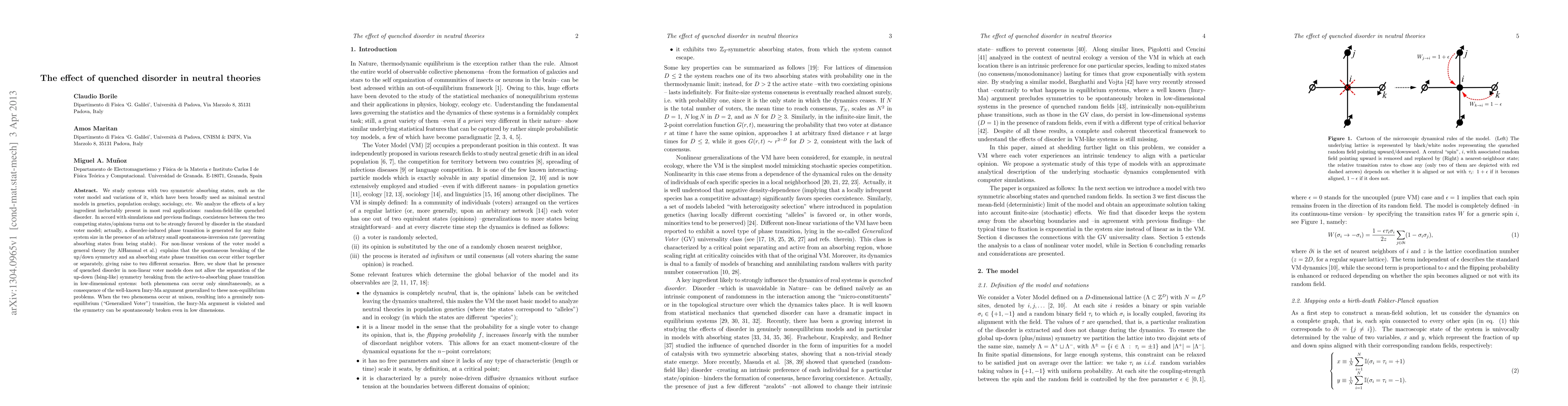This paper investigates the impact of quenched disorder in neutral models, particularly the voter model, revealing that disorder strongly favors coexistence between competing states. In non-linear versions, the presence of quenched disorder leads to simultaneous spontaneous symmetry breaking and phase transitions, violating the Imry-Ma argument in low-dimensional systems.