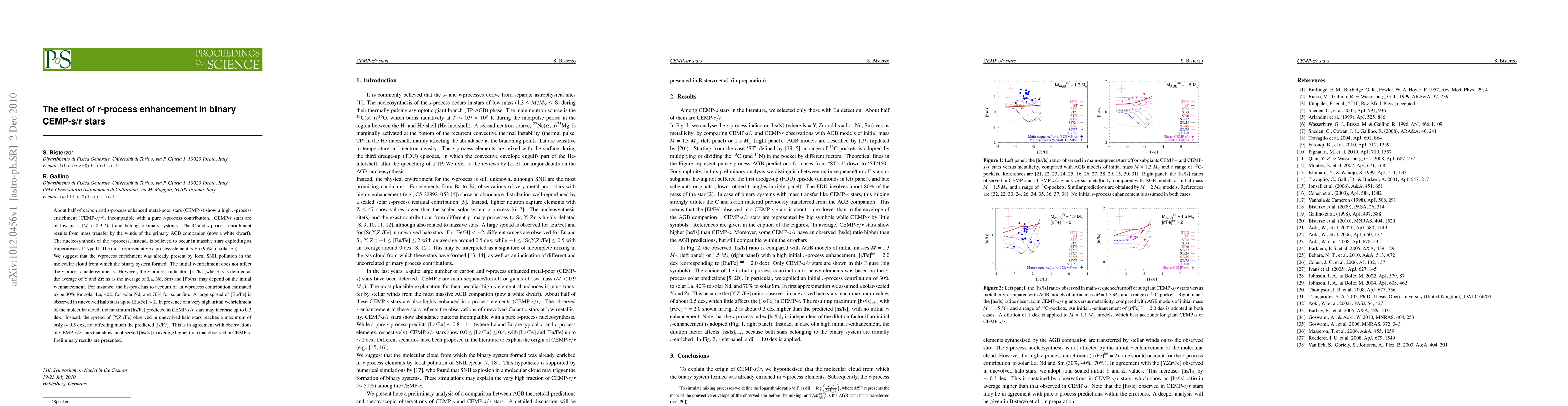 About half of carbon and s-process enhanced metal-poor stars (CEMP-s) show a high r-process enrichment (CEMP-s/r), incompatible with a pure s-process contribution. CEMP-s stars are of low mass (M < 0.9 Msun) and belong to binary systems. The C and s-process enrichment results from mass transfer by the winds of the primary AGB companion (now a white dwarf). The nucleosynthesis of the r-process, instead, is believed to occur in massive stars exploding as Supernovae of Type II. The most representative r-process element is Eu (95% of solar Eu). We suggest that the r-process enrichment was already present by local SNII pollution in the molecular cloud from which the binary system formed. The initial r-enrichment does not affect the s-process nucleosynthesis. However, the s-process indicators [hs/ls] (where ls is defined as the average of Y and Zr; hs as the average of La, Nd, Sm) and [Pb/hs] may depend on the initial r-enhancement. For instance, the hs-peak has to account of an r-process contribution estimated to be 30% for solar La, 40% for solar Nd, and 70% for solar Sm. A large spread of [Eu/Fe] is observed in unevolved halo stars up to [Eu/Fe] ~ 2. In presence of a very high initial r-enrichment of the molecular cloud, the maximum [hs/Fe] predicted in CEMP-s/r stars may increase up to 0.3 dex. Instead, the spread of [Y,Zr/Fe] observed in unevolved halo stars reaches a maximum of only ~ 0.5 dex, not affecting much the predicted [ls/Fe]. This is in agreement with observations of CEMP-s/r stars that show an observed [hs/ls] in average higher than that observed in CEMP-s. Preliminary results are presented.