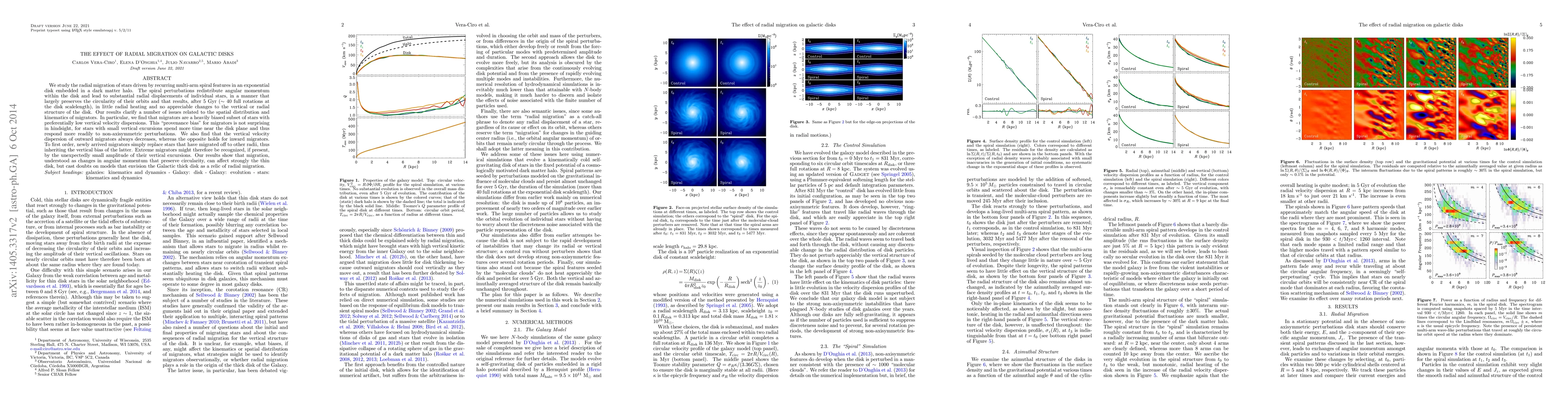 This paper investigates the impact of radial migration of stars driven by spiral perturbations in galactic disks, revealing that such migration preserves circular orbits and minimally alters disk structure. It highlights that migrators exhibit a "provenance bias" with low vertical velocity dispersions, and that outward migrators tend to have decreasing vertical dispersions while inward migrators show the opposite trend.