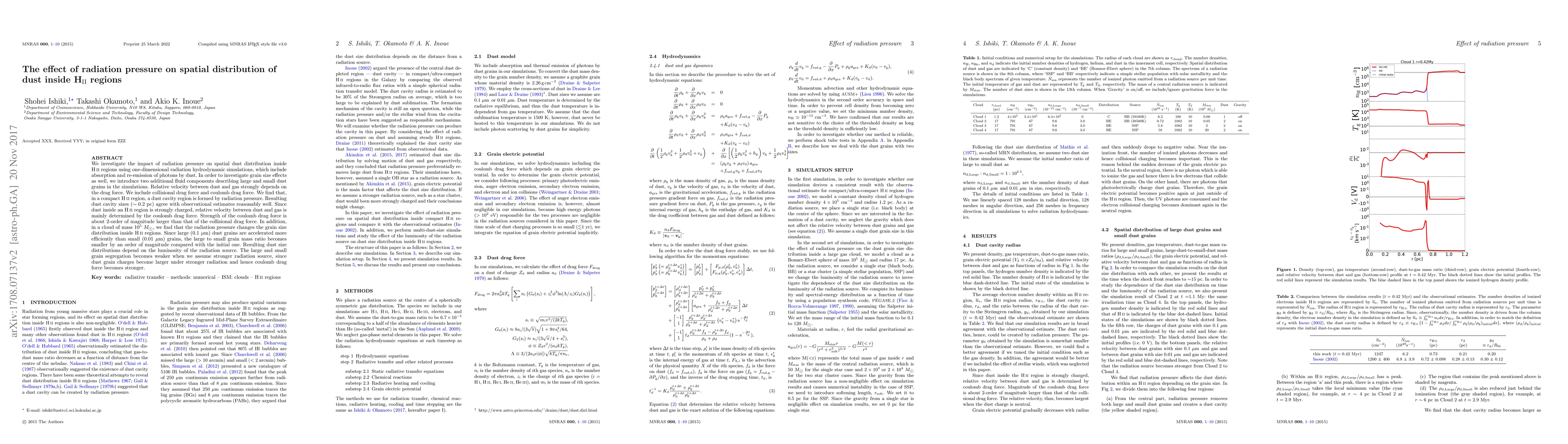 We investigate the impact of radiation pressure on spatial dust distribution inside H$_\mathrm{II}$ regions using one-dimensional radiation hydrodynamic simulations, which include absorption and re-emission of photons by dust. In order to investigate grain size effects as well, we introduce two additional fluid components describing large and small dust grains in the simulations. Relative velocity between dust and gas strongly depends on the drag force. We include collisional drag force and coulomb drag force. We find that, in a compact H$_\mathrm{II}$ region, a dust cavity region is formed by radiation pressure. Resulting dust cavity sizes (~0.2 pc) agree with observational estimates reasonably well. Since dust inside an H$_\mathrm{II}$ region is strongly charged, relative velocity between dust and gas is mainly determined by the coulomb drag force. Strength of the coulomb drag force is about 2-order of magnitude larger than that of the collisional drag force. In addition, in a cloud of mass $10^5$ $M_{\odot}$, we find that the radiation pressure changes the grain size distribution inside H$_\mathrm{II}$ regions. Since large (0.1 $\mathrm{\mu m}$) dust grains are accelerated more efficiently than small (0.01 $\mathrm{\mu m}$) grains, the large to small grain mass ratio becomes smaller by an order of magnitude compared with the initial one. Resulting dust size distributions depend on the luminosity of the radiation source. The large and small grain segregation becomes weaker when we assume stronger radiation source, since dust grain charges become larger under stronger radiation and hence coulomb drag force becomes stronger.